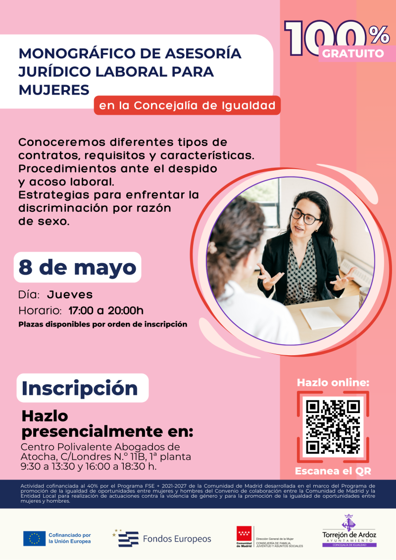 Dirigido a mujeres que quieran informarse en el ámbito jurídico-laboral. Conoceremos diferentes tipos de contratos, requisitos y características. Procedimientos ante el despido y acoso laboral. Estrategias para enfrentarse a la discriminación por razón de sexo.