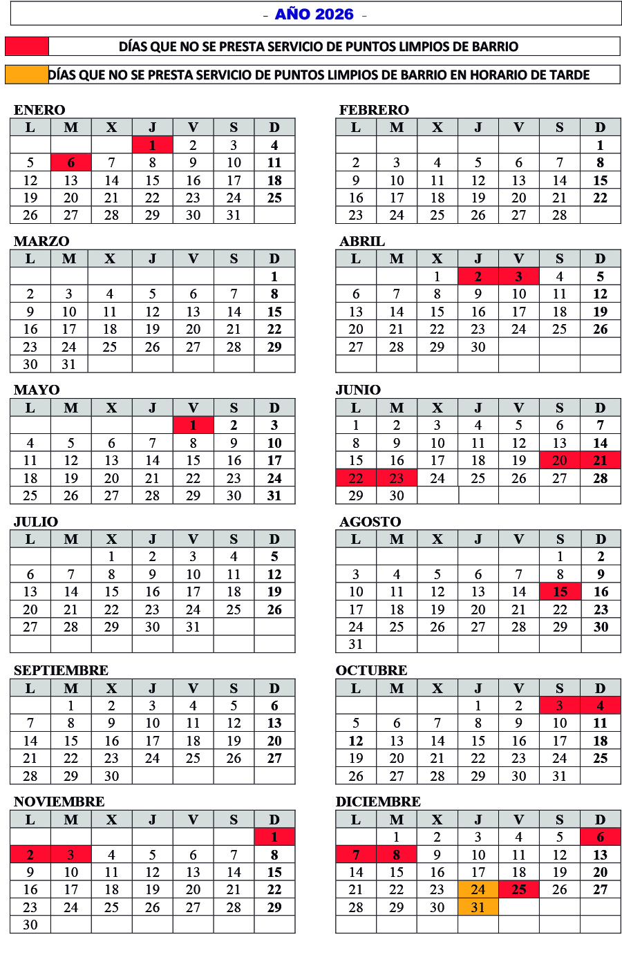 Son 11 Puntos Limpios de Barrio que se instalan en zonas delimitadas por placas informativas un día a la semana en diferentes barrios de la ciudad en horario de 11:00 a 19:00 horas, a excepción del que se sitúa los miércoles en el Barrio del Castillo y Aldovea (aparcamiento junto al colegio Miguel Hernández) que tiene un horario especial de 10:00 a 14:00 horas. Además, los días 25 de diciembre, 1 y 6 de enero, Jueves Santo y Viernes Santo, sábado, domingo, lunes y martes de las Fiestas Populares, sábado y domingo de las Fiestas Patronales y el 12 de octubre, no se prestará el servicio de los Puntos Limpios de Barrio. Los días 24 y 31 de diciembre el horario será de 11:00 a 14:00 horas.