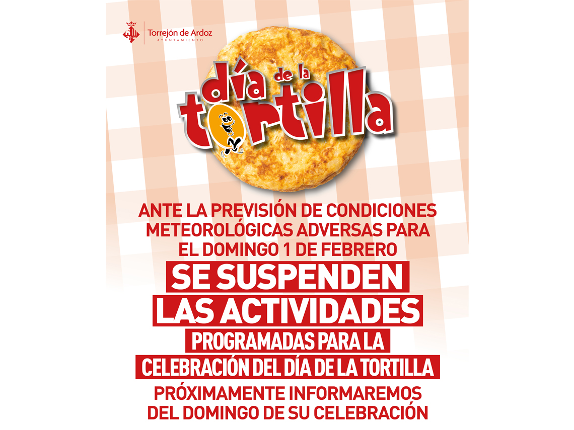 Torrejón de Ardoz, 29 de enero de 2026. Ante la previsión de condiciones meteorológicas adversas para este domingo 1 de febrero, se suspenden las actividades programadas para la celebración del Día de la Tortilla. Próximamente se informará del domingo de su celebración.