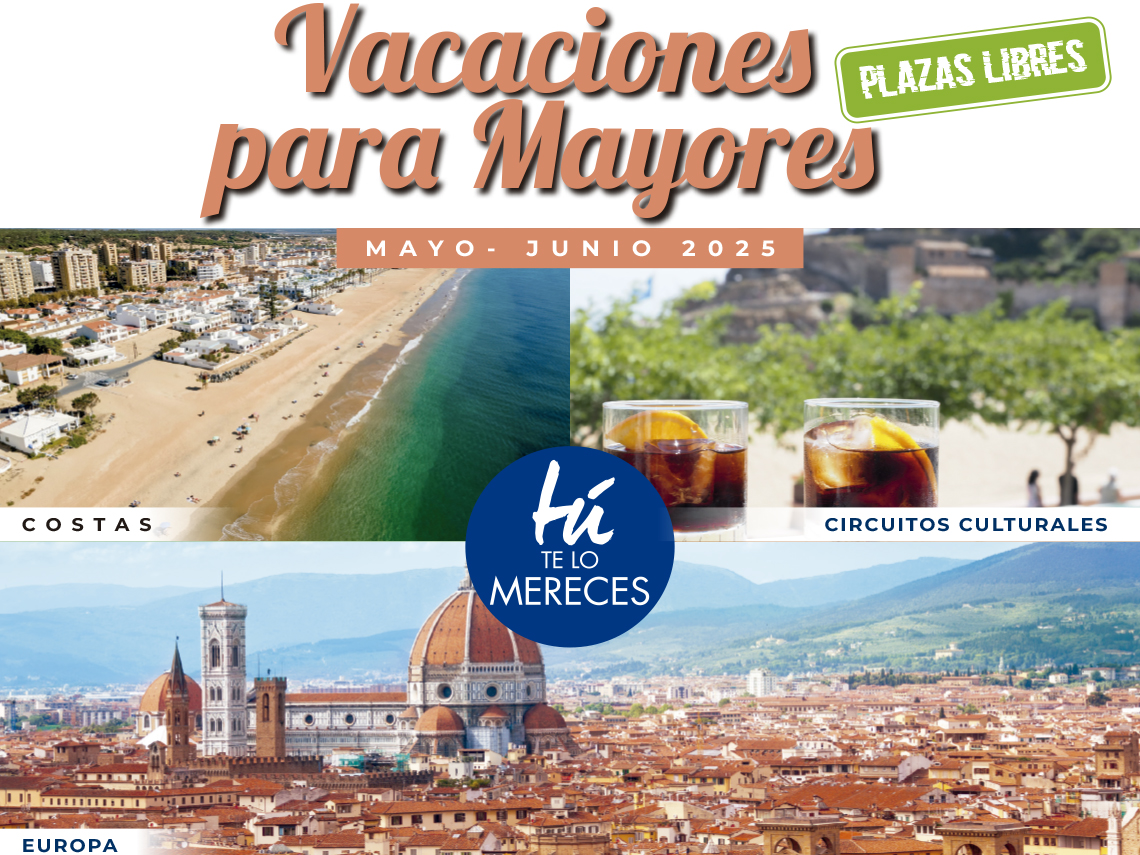 Aún quedan plazas para inscribirse en el programa Vacaciones de Mayores en los destinos de Torremolinos, Cabo de Gata y Alpujarras y Florencia (Italia). Las solicitudes están disponibles en la Concejalía de Mayores. Las inscripciones se podrán presentar hasta cubrir plazas, presencialmente en la Concejalía de Mayores (avenida Virgen de Loreto, 2) de 09:00 a 13:00 horas o enviando solicitud por correo electrónico al correo: mayores@ayto-torrejon.es