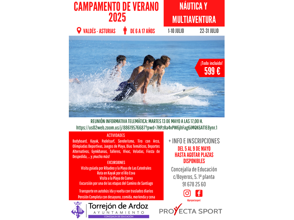 Torrejón de Ardoz, 5 de mayo de 2025. La iniciativa está dirigida a niños de 6 a 17 años y se desarrollará en Valdés. Se realizarán actividades y excursiones de náutica y multiaventura, como Bodyboard, Kayak, Padelsurf, senderismo, juegos de playa, olimpiadas deportivas, tiro con arco, vivac, gymkanas, talleres, veladas o días temáticos, entre otras. Además, habrá visitas guiadas por Ribadeo y la Playa de Las Catedrales, una ruta en Kayak por el Río Esva, otra visita a la Playa de Cueva o una excursión por una de las etapas del Camino de Santiago.