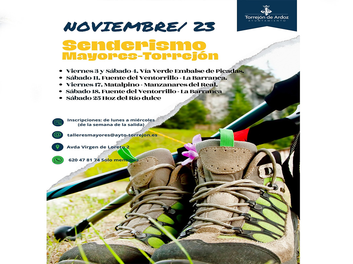 • Además, continúa abierta la inscripción para participar en el Programa de Senderismo cuyas próximas citas serán el próximo el viernes, 17 de noviembre, a Matalpino-Manzanares del Real y el sábado, 18 de noviembre, a Fuente del Ventorrillo- La Barranca. Estas aventuras culminarán con una visita a la Hoz del Río Dulce el 25 de noviembre. Las inscripciones se realizan de lunes a miércoles de la semana de la salida y pueden hacerse en la Concejalía de Mayores del Ayuntamiento de Torrejón de Ardoz, situada en la avenida Virgen de Loreto 2, en el teléfono 91 656 65 14 o 620 47 81 74 (sólo mensajes) y a través del e-mail talleresmayores@ayto-torrejon.es