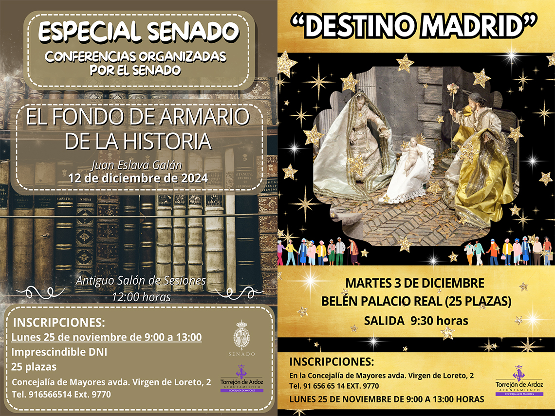 • Continua “Destino Madrid”, que busca acercar a los mayores de Torrejón al Patrimonio de la capital y cuyas próximas visitas serán el 10 de diciembre al Belén del Palacio Real de Madrid, una representación que destaca por su valor artístico y tradición; y el 12 de diciembre al Senado, donde los participantes podrán asistir a la conferencia “El fondo de armario de la historia”, impartida por el prestigioso escritor Juan Eslava Galán. Las inscripciones se podrán realizar el lunes, 25 de noviembre, de 9:00 a 13:00 horas, en la Concejalía de Mayores (avenida Virgen de Loreto, 2) y a través del teléfono 91 656 65 14
