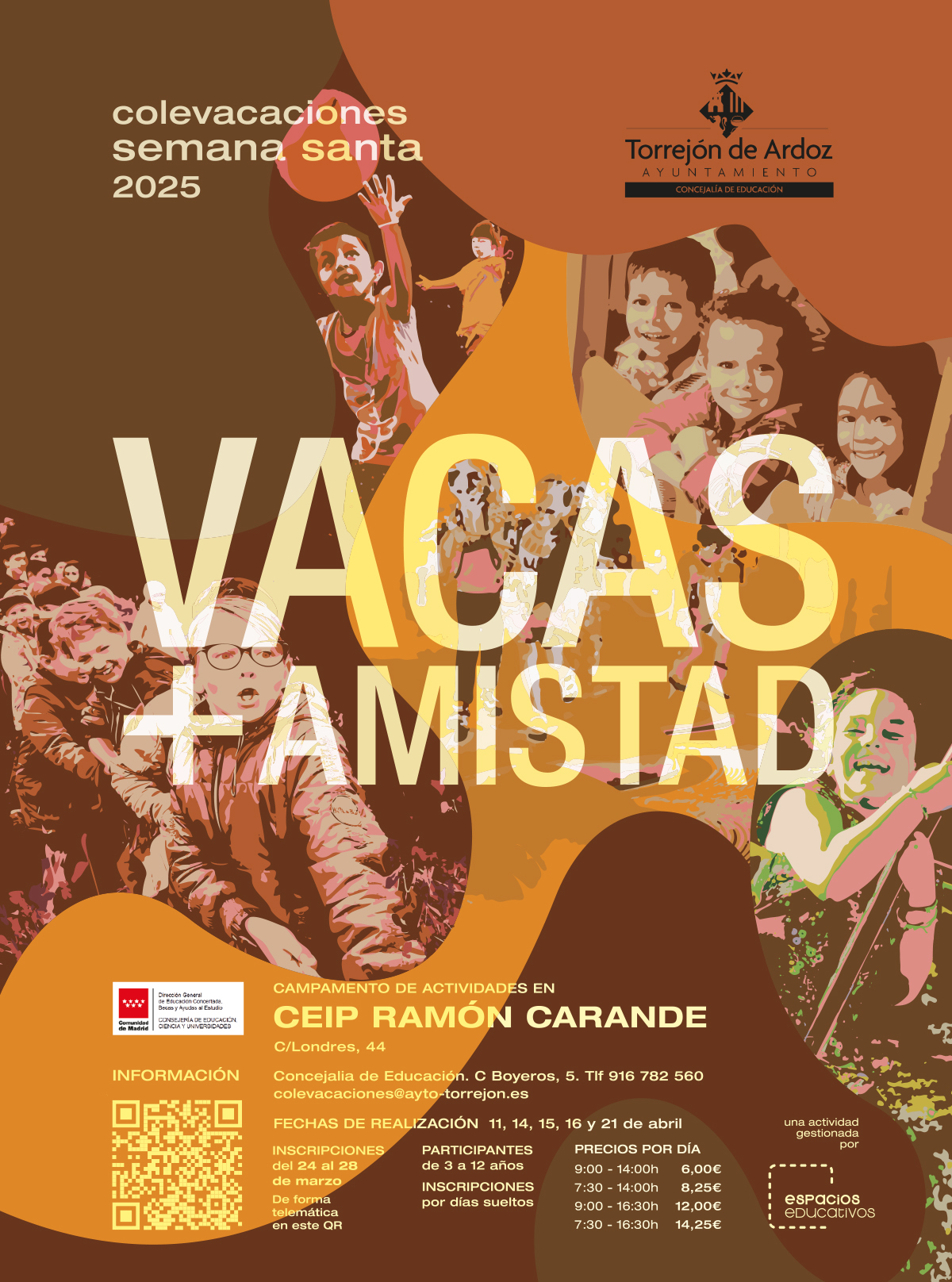 Del 24 al 28 de marzo próximos permanecerá abierto el plazo de inscripción para las Colevacaciones de Semana Santa, que vuelven a ponerse en marcha con el objetivo de promover la conciliación de la vida familiar y laboral. Las inscripciones se podrán realizar de forma presencial en la Concejalía de Educación, situada en la calle Boyeros, 5 en horario de lunes a viernes de 9:00 a 14:00 horas; a través del teléfono 91 678 25 60 y por correo electrónico en colevacaciones@ayto-torrejon.es. También de forma telemática a través del código QR situado en los carteles de las Colevacaciones.