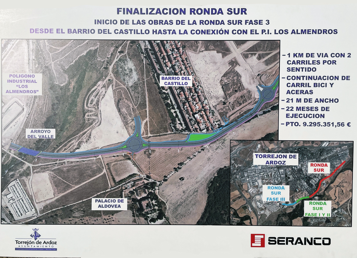 Torrejón de Ardoz, 9 de octubre de 2025. Esta 3ª fase, unida a las 2 anteriores, completará la Ronda Sur y unirá la carretera de Loeches (Rotonda Torre Eiffel-Parque Europa) con el Polígono Los Almendros, hasta la rotonda final del Polígono Las Monjas dirección M45 y M50, desdoblando y modificando el actual trazado de la carretera del barrio Castillo. Está prevista que las obras finalicen a finales de 2026 y supone una inversión del Ayuntamiento de 9,29 millones de euros.