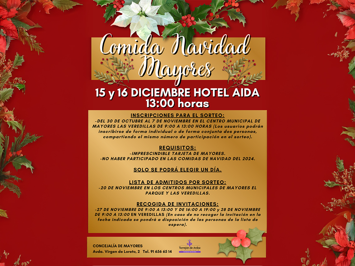 Con el fin de favorecer el encuentro y las relaciones interpersonales, como medida contra la soledad no deseada, el Ayuntamiento de Torrejón de Ardoz organiza comidas navideñas para los mayores de la ciudad, que se celebrarán los días 15 y 16 de diciembre. Para participar en el sorteo, bien de manera individual o de forma conjunta dos personas, compartiendo el mismo número, será necesario inscribirse hasta el próximo 7 de noviembre, en el Centro Municipal de Mayores Las Veredillas, en horario de 9:00 a 13:00 horas.