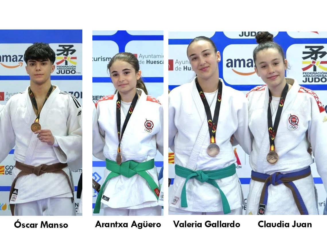 Torrejón de Ardoz, 13 de mayo de 2025. El Campeonato de España de categoría infantil y cadete se disputó el fin de semana del 26 y 27 de abril en Huesca. Los cuatro torrejoneros que se colgaron la medalla de bronce fueron Óscar Manso en -66 kilos en la categoría cadete; Arantxa Agüero en -36 kilos en la categoría infantil; Valeria Gallardo en -48 kilos en la categoría infantil y Claudia Juan en -48 kilos en la categoría infantil. También hay que resaltar el esfuerzo de las dos judokas que hicieron un buen campeonato disputando el combate para la medalla de bronce y que al final no pudieron hacerse con este metal que fueron Carolina Caro y Sara Fraile.