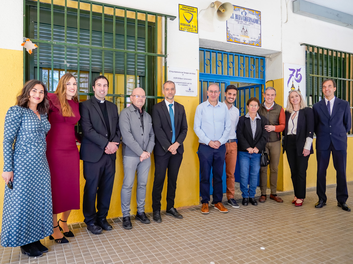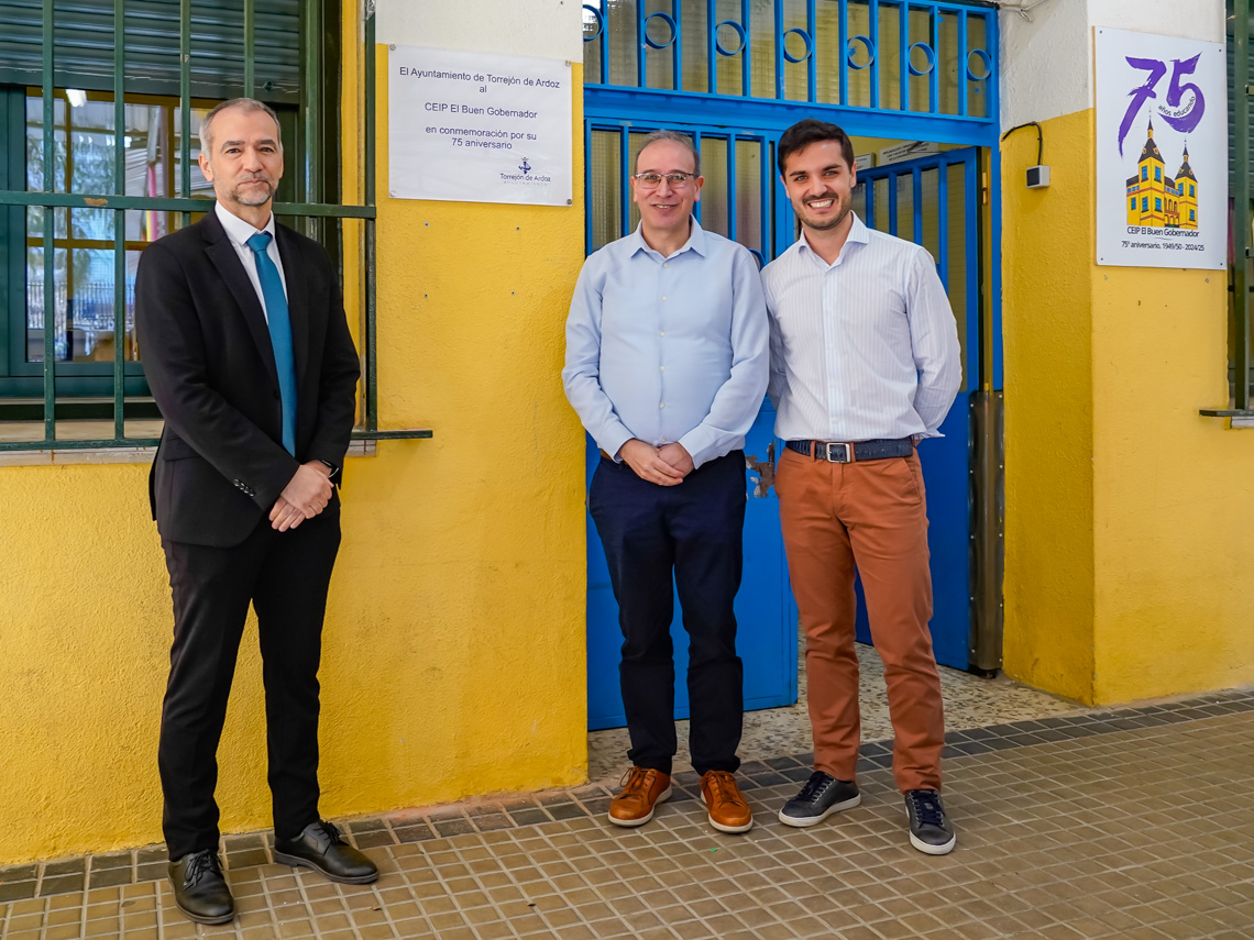 El CEIP Buen Gobernador cumple 75 años de vida. Por ello, el alcalde, Alejandro Navarro y el concejal de Educación, Bienestar e Inmigración, Rubén Martínez, visitaron el pasado martes sus instalaciones, acompañados por el director del Área Territorial de Madrid-Este de la Consejería de Educación, Marcos Rafael Moreno Sánchez, el director del centro educativo torrejonero, Félix Sánchez-Román Jiménez, el teniente de alcalde, Valeriano Díaz, la concejala, María Ángeles Jiménez, así como profesores en activo, profesores jubilados, alumnos, antiguos alumnos, madres y padres. “Es un honor estar aquí en una celebración tan importante del colegio más longevo de nuestra ciudad, siendo un referente escolar”, destacó el primer edil.