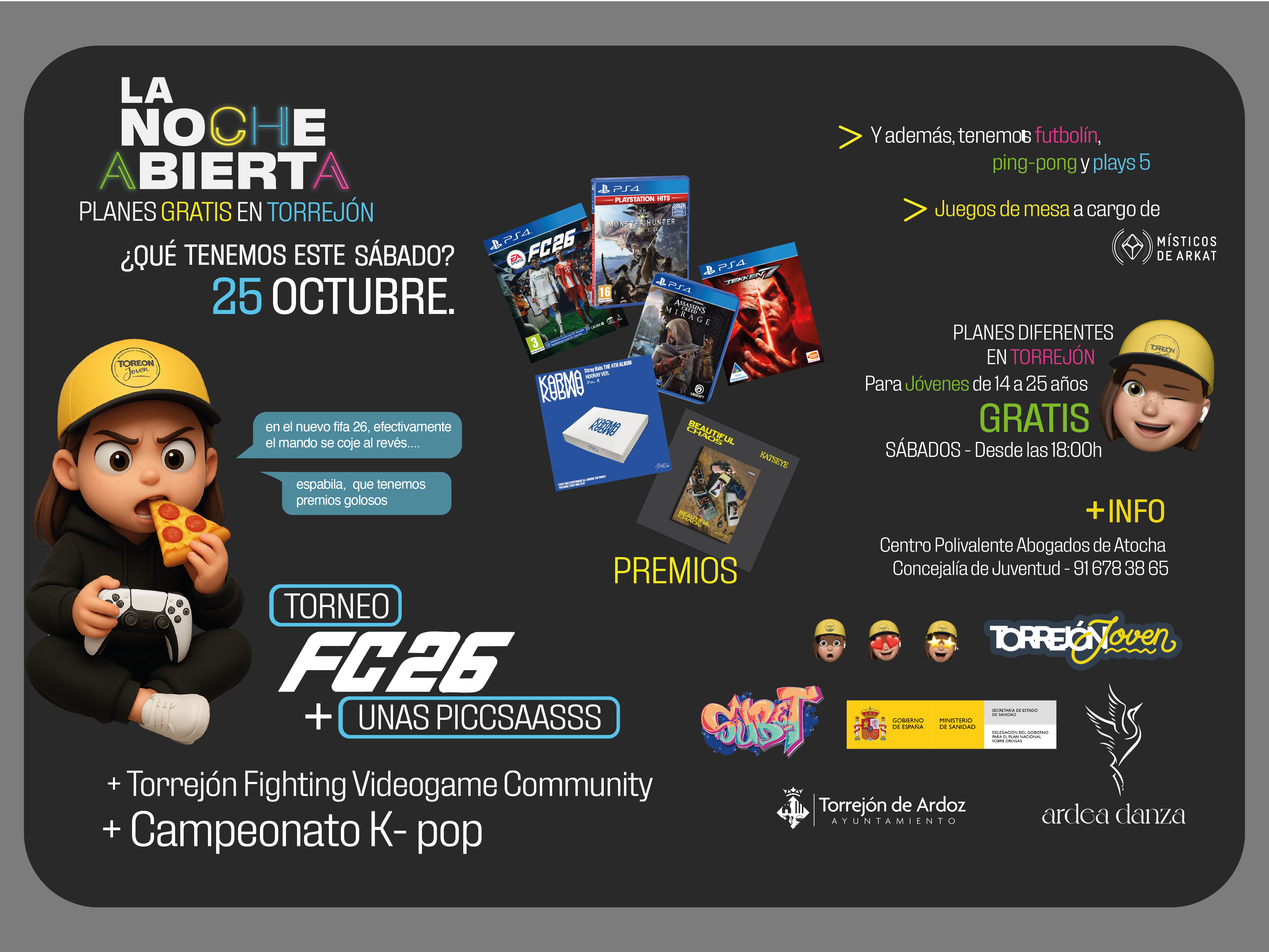 Los amantes del fútbol y los videojuegos vuelven a tener una cita ineludible. El FIFA 26 llega mañana sábado, 25 de octubre, a “La Noche Abierta” para quienes quieran demostrar sus habilidades, retándose en emocionantes partidas, donde la competición se mezclará con la diversión. Las inscripciones se podrán realizar de 18:00 a 19:00 horas, habiendo premios para el primer y segundo ganador y sorteos entre todos los asistentes. Un plan perfecto que además llega con un campeonato K-pop (música popular de Corea del Sur) y sabrosa pizza para hacer aún más amena la velada, contando también con una jornada de videojuegos de lucha, con Torrejón Fighting Videogame Community. Así que, ya sea que vengas a probar el juego, a mostrar tu talento, a animar o solo a comer pizza, esa noche es tuya.