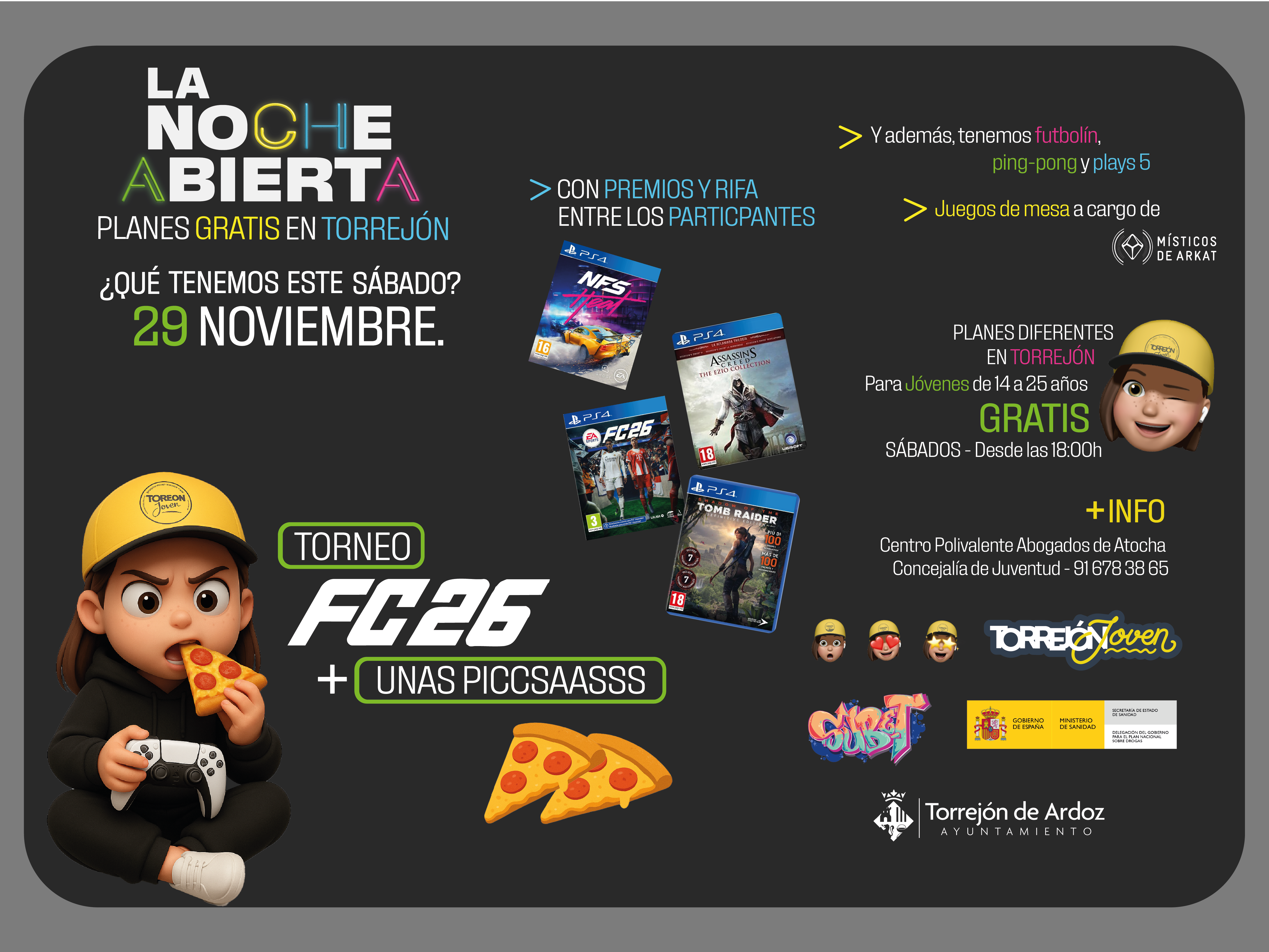 • Quienes quieran demostrar sus habilidades, retándose en emocionantes partidas, donde la competición se mezclará con la diversión podrán hacerlo mañana sábado, 29 de noviembre, con el torneo FIFA 26, que llega a “La Noche Abierta” para hacer las delicias de sus seguidores. Las inscripciones se podrán realizar de 18:00 a 19:00 horas, habiendo premios para el primer y segundo ganador y sorteos entre todos los asistentes. Un plan perfecto que además llega con sabrosa pizza para hacer aún más amena la velada