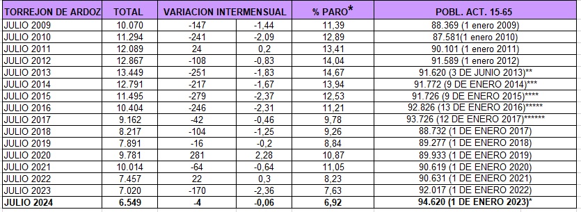 El paro en Torrejón de Ardoz continúa bajando y la ciudad ha registrado el menor número de desempleados en un mes de julio desde hace 16 años, con 6.549 personas. El número total de desempleados de la ciudad se ha reducido a más de la mitad desde 2013, cuando eran 13.449, a pesar de haber aumentado la población activa de Torrejón en 3.000 personas (94.620).