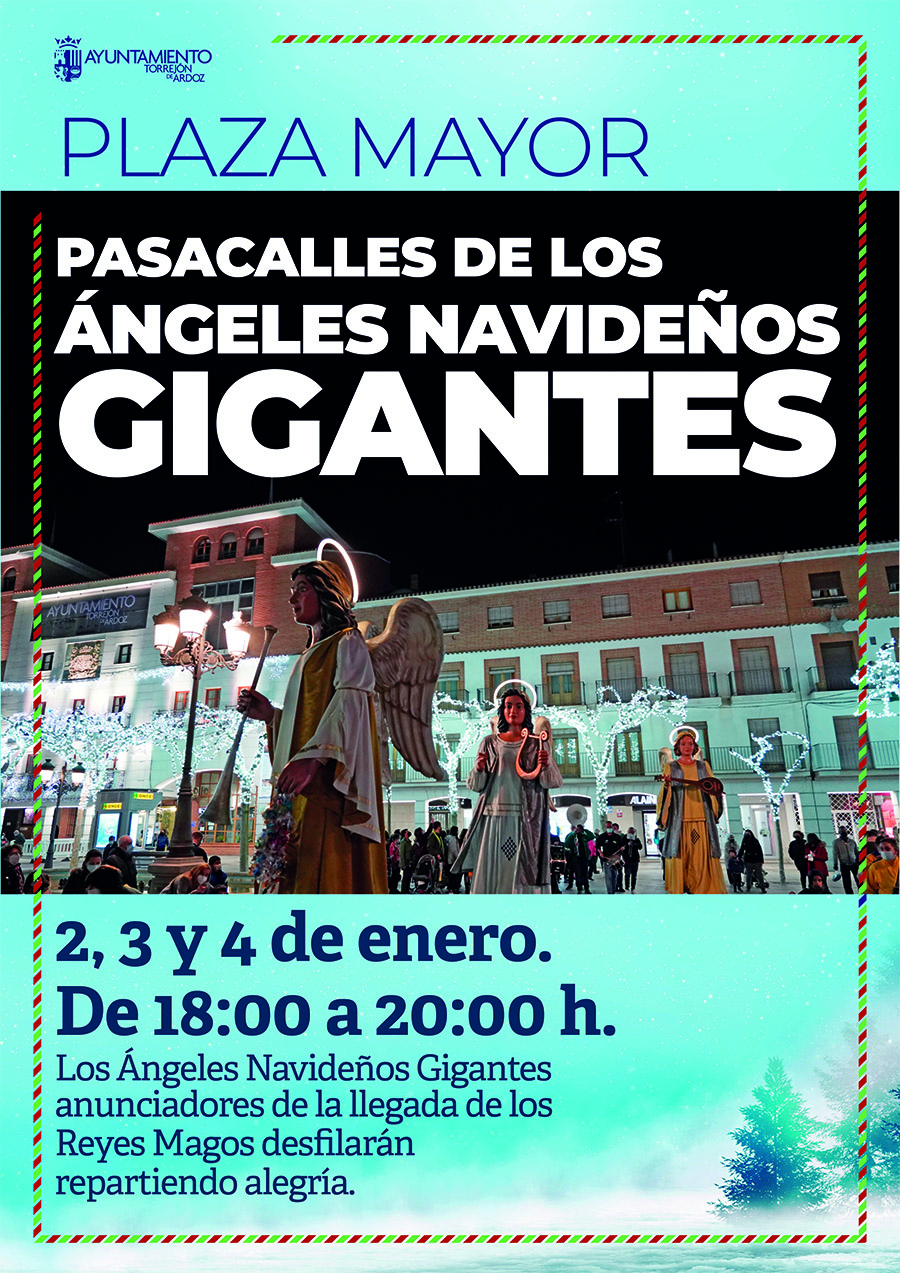 El Pasacalles de los Ángeles Navideños Gigantes para anunciar la llegada de los Reyes Magos continuará hoy miércoles 4 de enero en la Plaza Mayor-Plaza de la Navidad de Torrejón de Ardoz