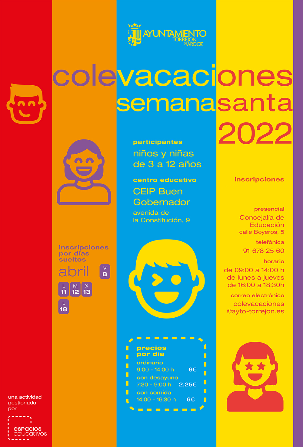 El plazo de inscripción para las “Colevacaciones” de Semana Santa continúa abierto hasta completar plazas. Esta iniciativa, que promueve la conciliación de la vida familiar y laboral, está dirigida a niños de entre 3 y 12 años. Se desarrollará en el colegio Buen Gobernador (avenida de la Constitución, 9) durante los días 8, 11, 12, 13 y 18 de abril por días sueltos o el programa completo. Las inscripciones se pueden realizar presencialmente en la Concejalía de Educación, situada en la calle Boyeros, 5 en un horario de lunes a viernes de 9:00 a 14:00 horas y por las tardes de 16.00 a 18:30 horas de lunes a jueves. Por teléfono en el 91 678 25 60 y por correo electrónico en colevacaciones@ayto-torrejon.es.