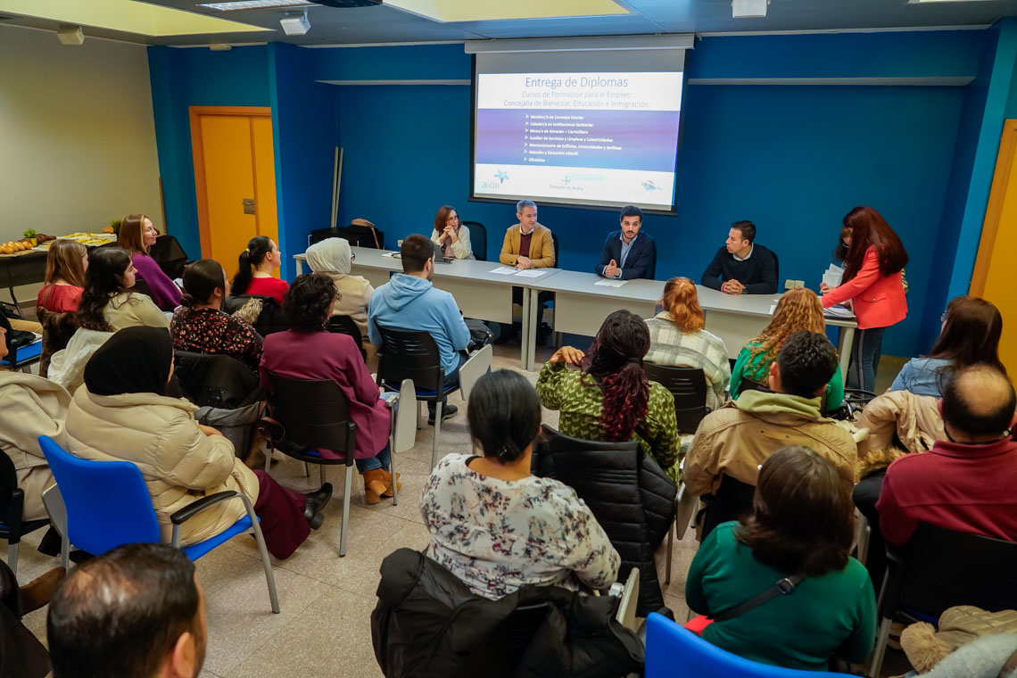 El Centro Polivalente Abogados de Atocha ha acogido esta mañana la entrega de los diplomas correspondientes a los alumnos que han superado con éxito los cursos de formación que ha organizado el Ayuntamiento de Torrejón de Ardoz, a través de su Concejalía de Inmigración. Se trata de los perfiles de “Ofimática-Aplicaciones informáticas de gestión”, “Monitor de comedor escolar” (incluye el Certificado de Manipulador de Alimentos), “Atención y Educación infantil”, “Celador en instituciones sanitarias”, “Auxiliar de servicios y limpieza para colectividades” y “Mantenimiento de edificios comunes y jardines”. Han tenido una duración de 120 horas lectivas, de las cuales 80 han sido de prácticas profesionales, que han realizado en diferentes empresas, excepto el de ofimática, que no incluye prácticas. La cita ha contado con la presencia del alcalde, Alejandro Navarro Prieto, y el concejal de Bienestar, Educación e Inmigración, Rubén Martínez.