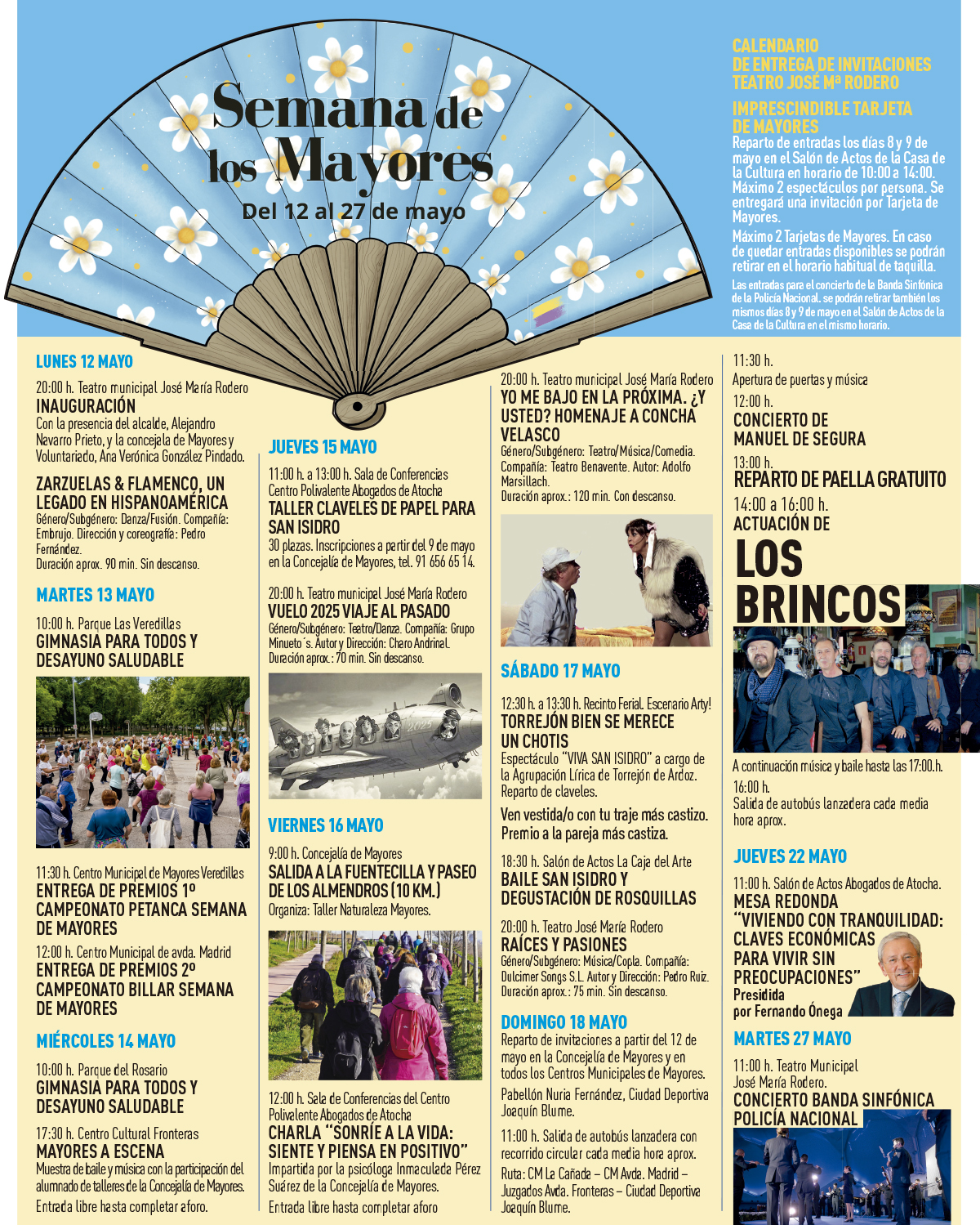 • Igualmente, el baile San Isidro y degustación de rosquillas, las entregas de premios del primer campeonato de petanca y del segundo campeonato de billar, el taller de claveles de papel, las salidas a la Fuentecilla y Paseo de Los Almendros, la mesa redonda “Viviendo con Tranquilidad: claves económicas para vivir sin preocupaciones”, presidida por Fernando Ónega, la charla “Sonríe a la vida: siente y piensa en positivo” o el concierto de la Banda Sinfónica de la Policía Nacional fueron otras de las iniciativas que también tuvieron muy buena acogida entre los mayores torrejoneros y completaron el amplio y atractivo programa de actividades