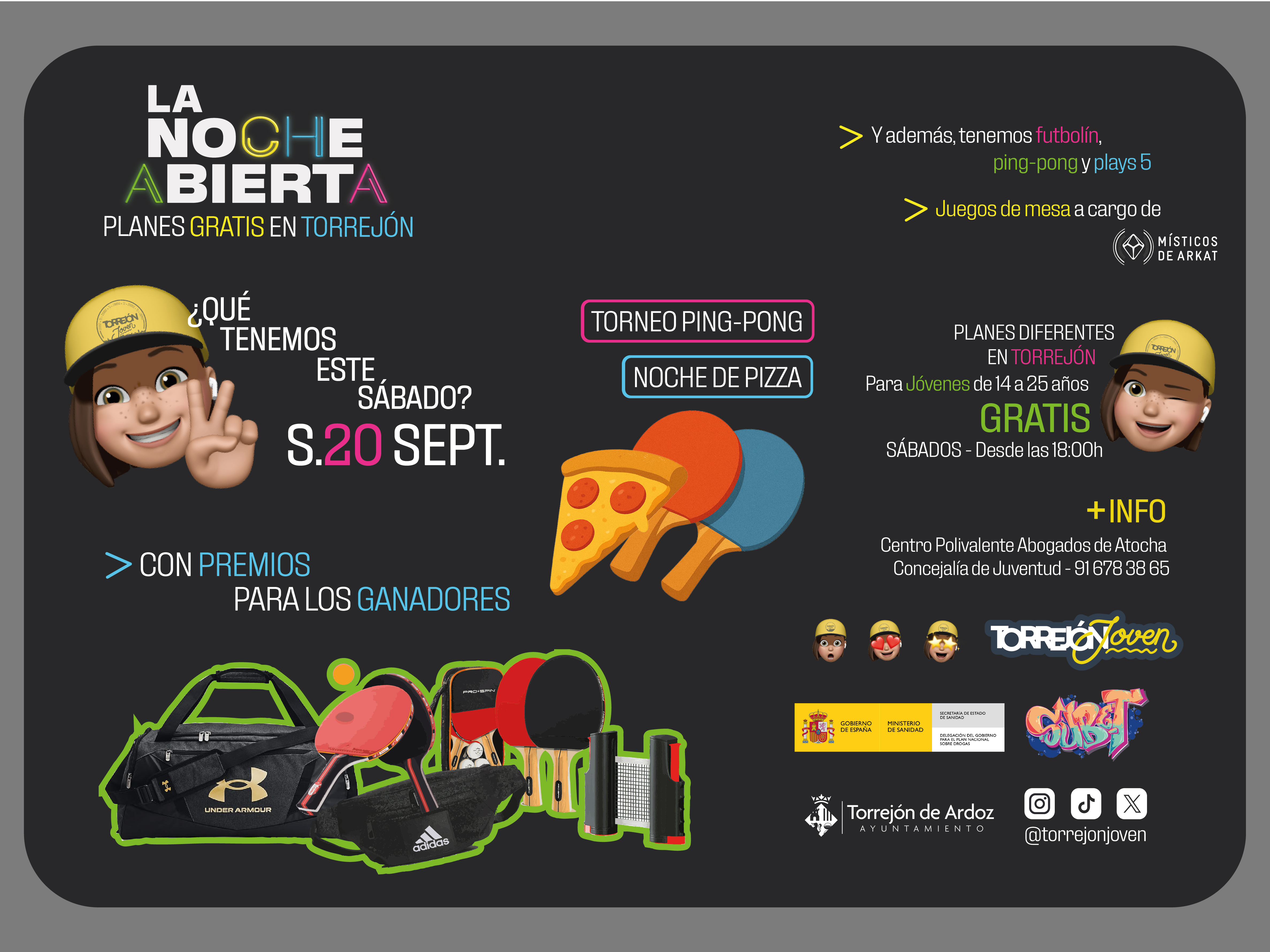 Torrejón de Ardoz, 18 de septiembre de 2025. “La Noche Abierta” es un programa con planes diferentes y gratuitos de ocio nocturno saludable para jóvenes de 14 a 25 años que se adaptan a todos los gustos y que tiene lugar a partir de las 18:00 horas en el Centro Polivalente Abogados de Atocha, donde también se podrá disfrutar de futbolín, ping-pong, plays 5 y juegos de mesa a cargo de la Asociación Juvenil Místicos de Arkat.