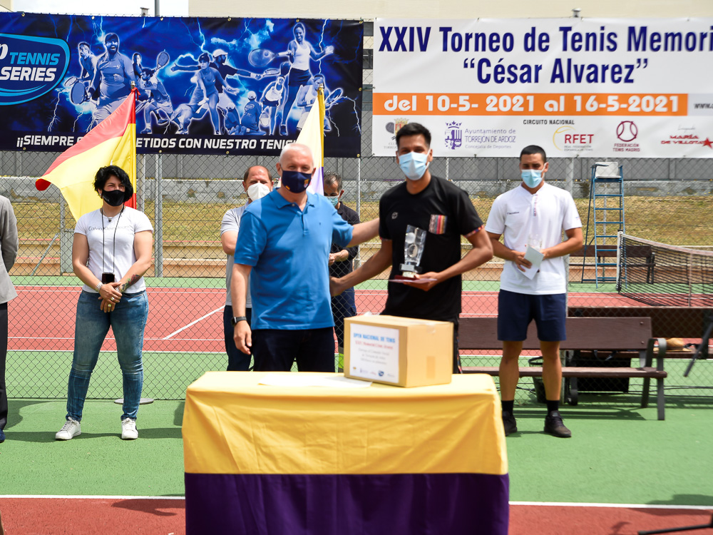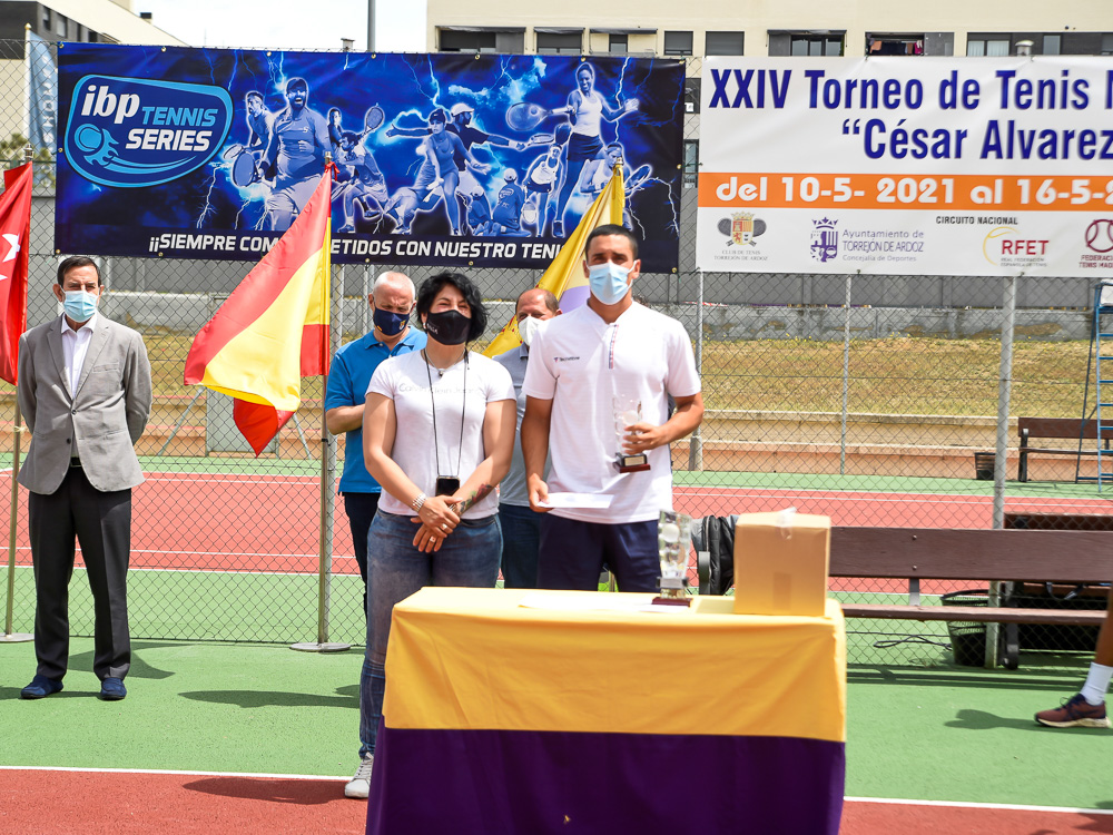 Torrejón de Ardoz, 18 de mayo de 2021. El torneo ha contado con la participación de 43 jugadores, ocho de ellos situados en el ránking entre los cien mejores de España, y se ha disputado en las pistas de la C.D. Joaquín Blume. En la entrega de premios estuvieron presentes el concejal de Deportes, José Miguel Martín Criado, y la concejal de Mujer, Míriam Gutiérrez, que acompañaron a Jesús de Castro, presidente del Club de Tenis Torrejón, Santiago Molina y Luis Díaz, vicepresidentes, José Luis Rascón, presidente de la Federación de Tenis de Madrid, y Manuel Cruz, presidente del Comedor Social de la ciudad que recibió un lote de productos de comida para repartir entre las personas más desfavorecidas de la ciudad.
