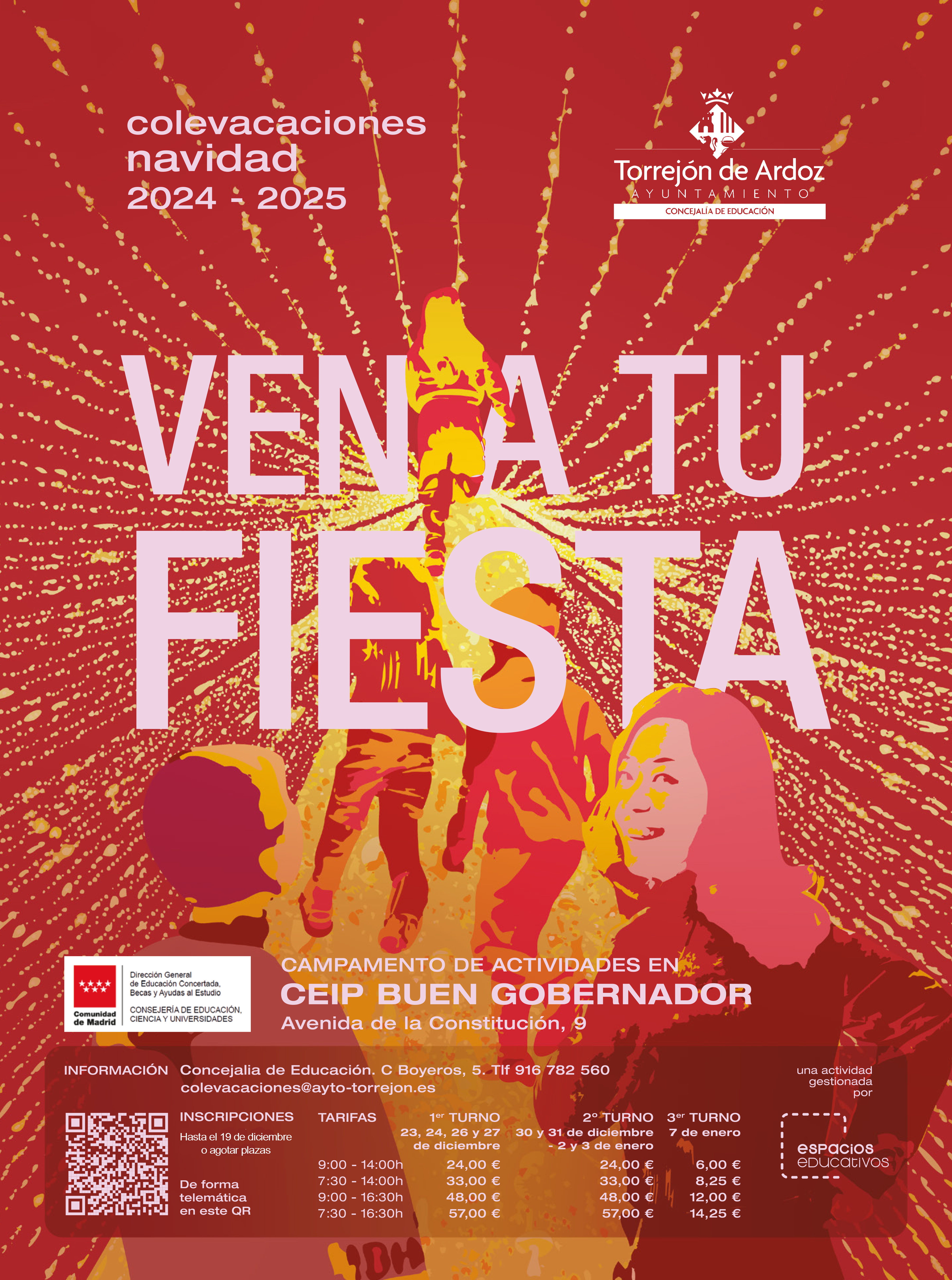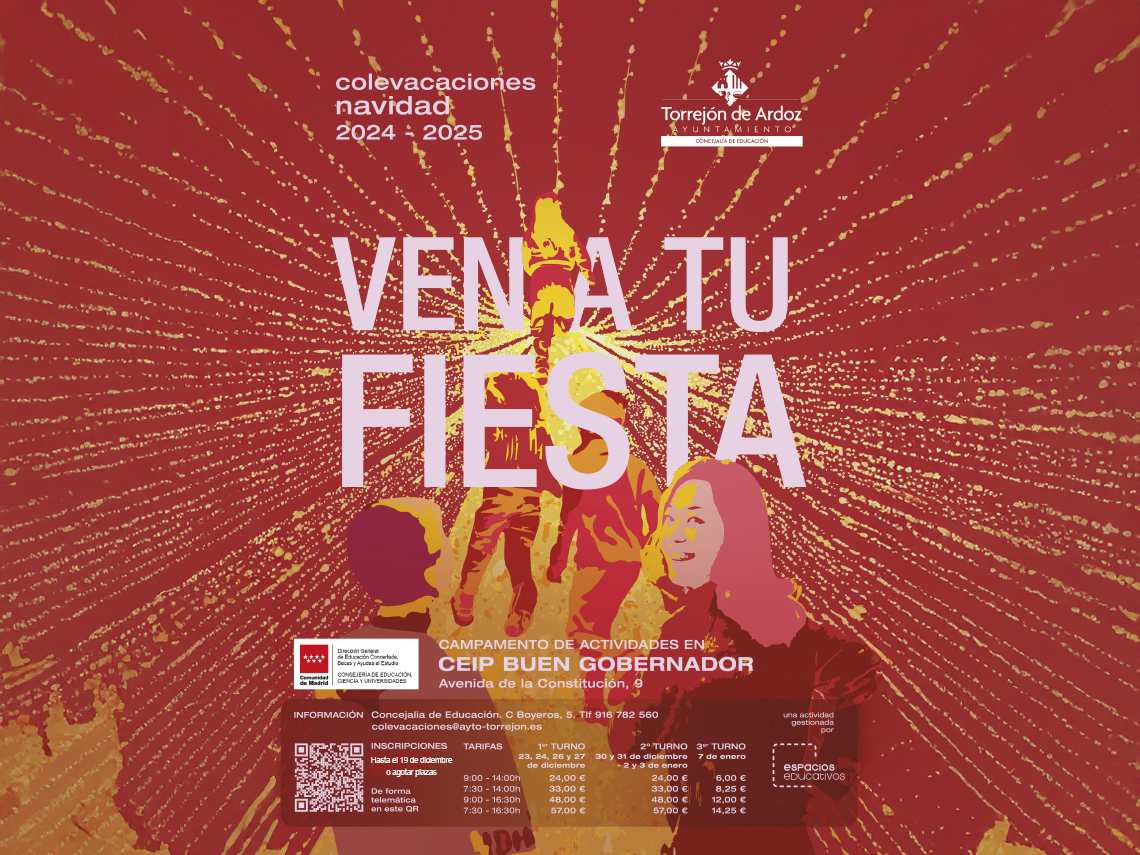 • Esta iniciativa está dirigida a los niños de entre 3 y 12 años y se realizará en el CEIP Buen Gobernador, situado en la avenida de la Constitución, 9. Los interesados podrán realizar la inscripción hasta agotar plazas a través del QR que aparece en el cartel. Para más información en la Concejalía de Educación (calle Boyeros, 5), en el teléfono 91 678 25 60 y en colevaciones@ayto-torrejon.es
