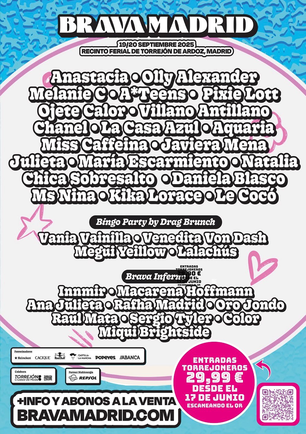 Por otra parte, Brava Madrid contará con el pop de la afamada cantante norteamericana Anastacia, la británica Melanie C ex Spice Girls, el también británico Olly Alexander, las eurovisivas Chanel y Daniela Blasco, con la referencia internacional urbana de Villano Antillano, con el indie de Miss Caffeína y La Casa Azul, o entre otros con el humor irreverente de Ojete Calor, todo ello animado por Lalachús y la Bingo Party con afamadas Drag Queens.