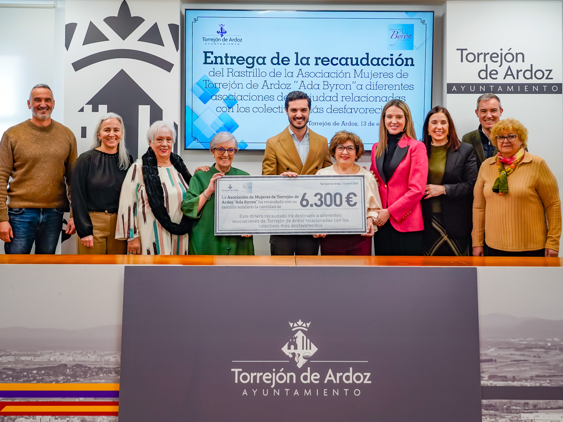 La Asociación de Mujeres de Torrejón de Ardoz Ada Byron entrega los 6.300 euros de la recaudación de su rastrillo solidario a diferentes asociaciones relacionadas con los colectivos más desfavorecidos de la ciudad. El acto tuvo lugar el pasado martes en el Salón de Plenillos del Ayuntamiento y contó con la presencia del alcalde, Alejandro Navarro Prieto; el concejal de Bienestar, Educación e Inmigración, Rubén Martínez; la edil de Mayores y Voluntariado, Ana Verónica González; la presidenta de la Asociación de Mujeres Ada Byron, Loli Rodríguez; otras socias de la entidad y representantes de los comercios locales y centros educativos que colaboraron en esta iniciativa, que ya es todo un clásico en la ciudad.