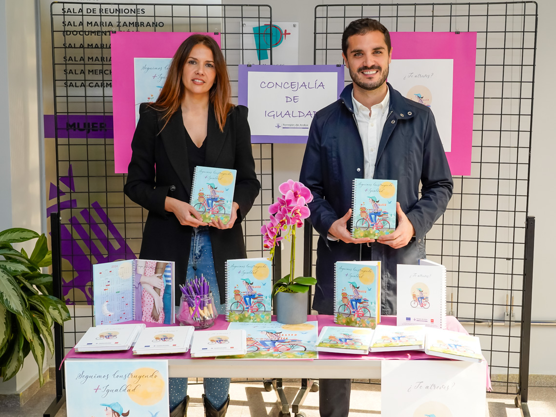 El alcalde, Alejandro Navarro Prieto, y la concejala de Igualdad y Festejos, María Eugenia Gil, han presentado el Cuaderno de Gestión del Tiempo que ha editado la Concejalía de Igualdad del Ayuntamiento de Torrejón de Ardoz con el lema “Seguimos construyendo+Igualdad, ¿te atreves?” y que invita a dar nuevos pasos durante todo el año para lograr la igualdad e incitar a comprometerse, aún más, con los cuidados, a recuperar la autonomía y tiempo para el disfrute personal, a través del reparto equitativo de cargas familiares entre hombres y mujeres. Aquellas personas mayores de 14 años que estén interesadas en obtener este cuaderno pueden recogerlo de forma gratuita, hasta agotar existencias, en la Concejalía de Igualdad, situada en el Centro Polivalente Abogados de Atocha (calle Londres 11B), en horario de lunes a viernes de 08:30 a 18:30 horas. Se entregará uno por persona, mostrando el DNI.