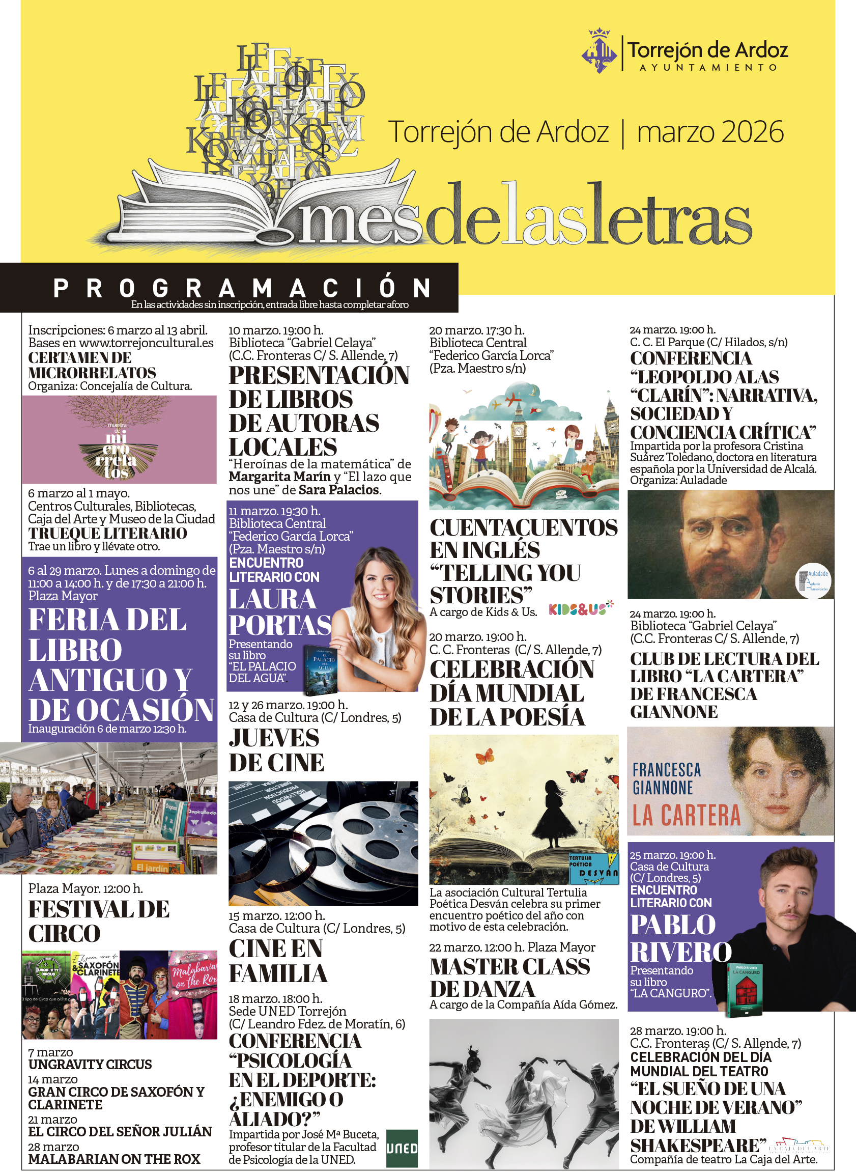 Se trata de una de las citas más destacadas dentro de las actividades que el Ayuntamiento de Torrejón ha organizado con motivo del Mes de las Letras, que tendrán a la lectura como gran protagonista con el objetivo de fomentarla entre todos los torrejoneros. En este sentido, cabe destacar el encuentro literario con Pablo Rivero, famoso por su participación en la mítica serie Cuéntame, que se celebrará el 25 de marzo, a las 19:00 horas, en la Casa de la Cultura, presentando su obra “La canguro”. A él se unirán dos autores más de primera línea que participarán durante el mes de abril.