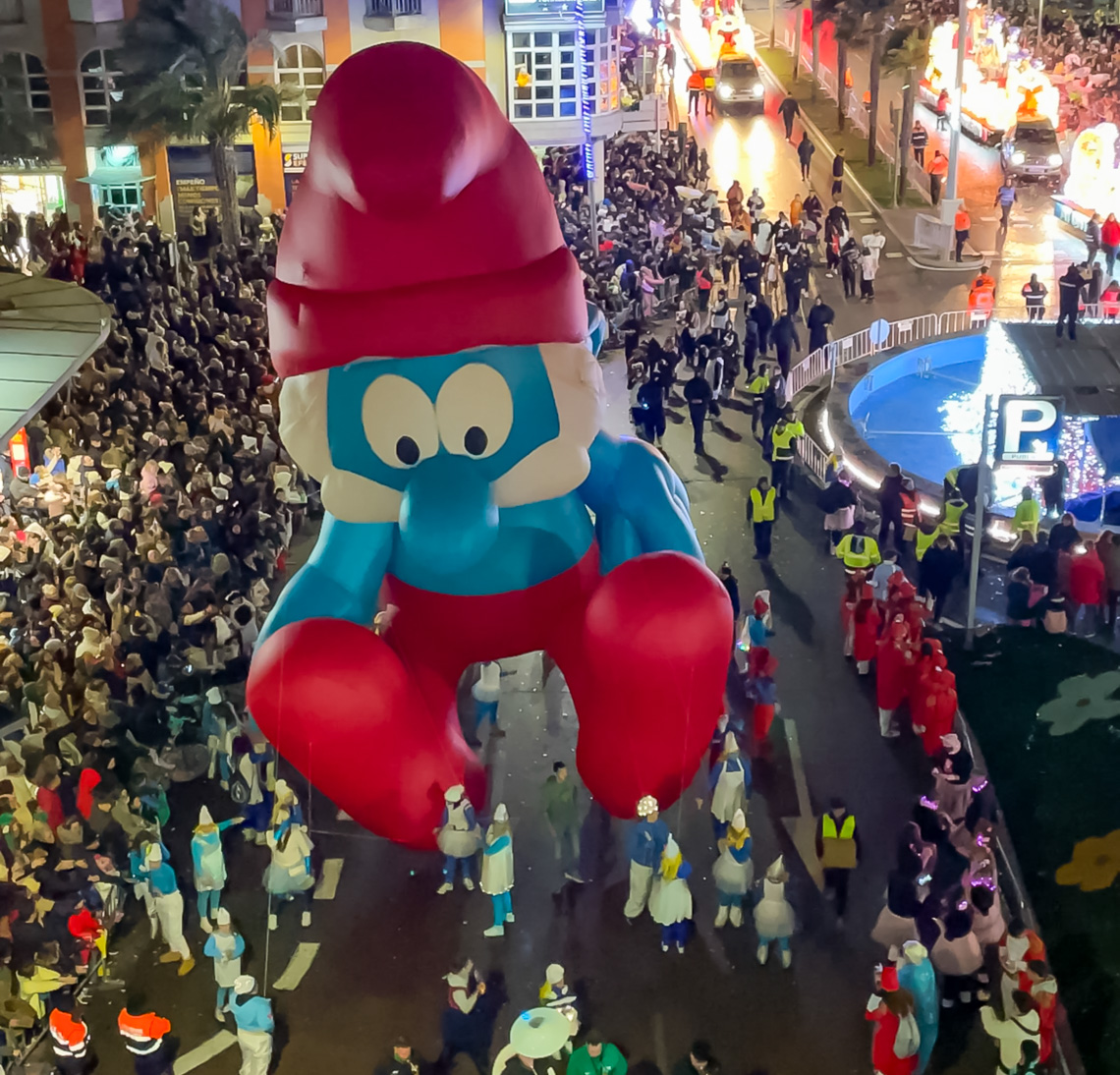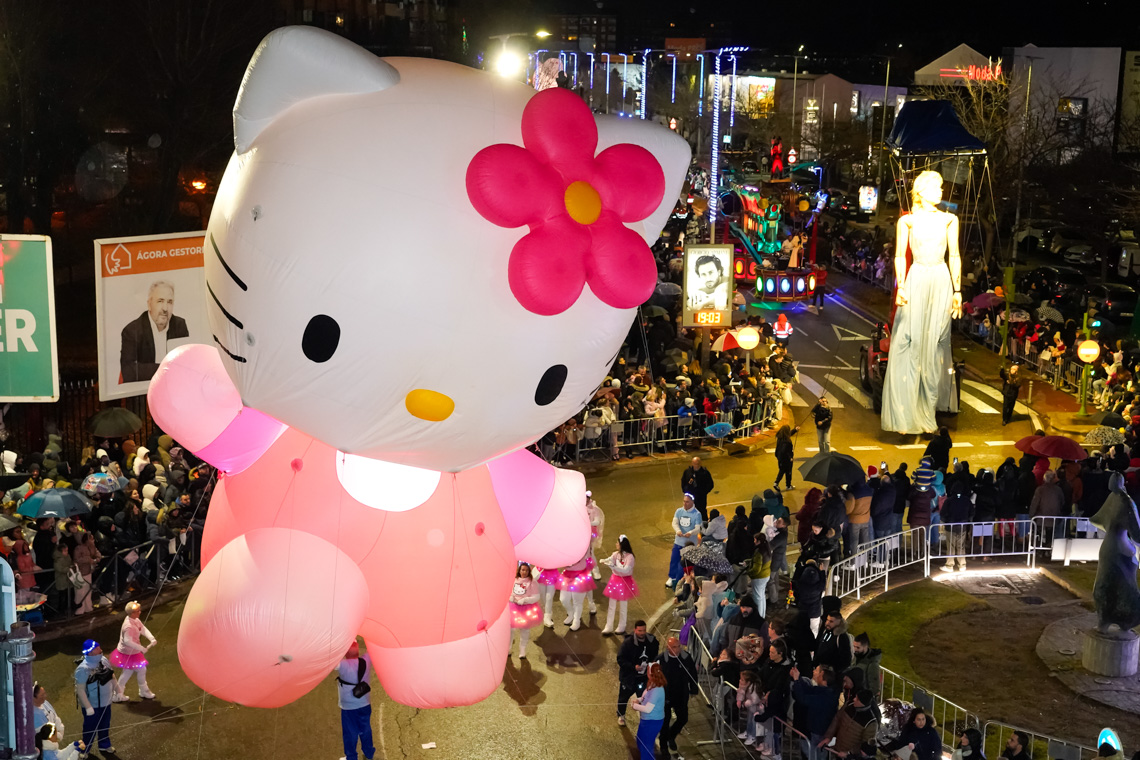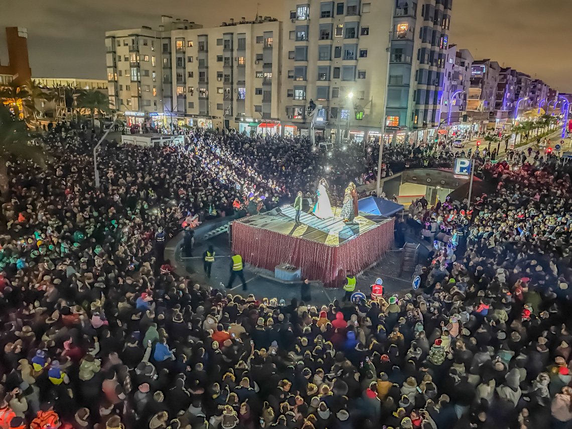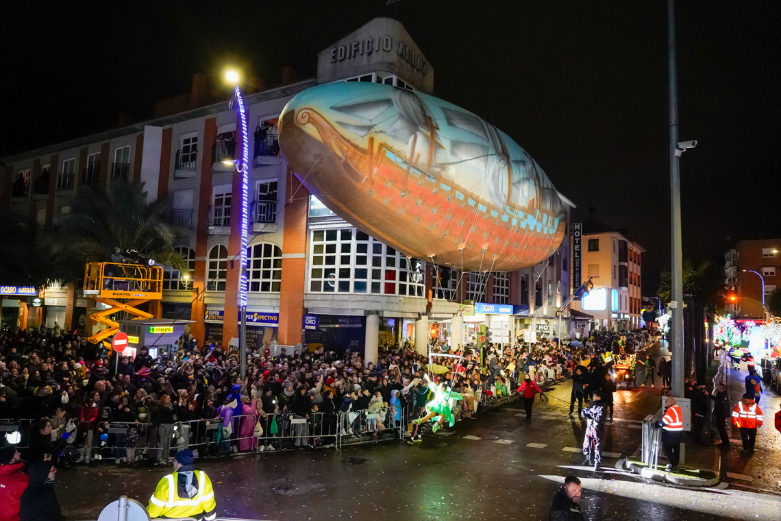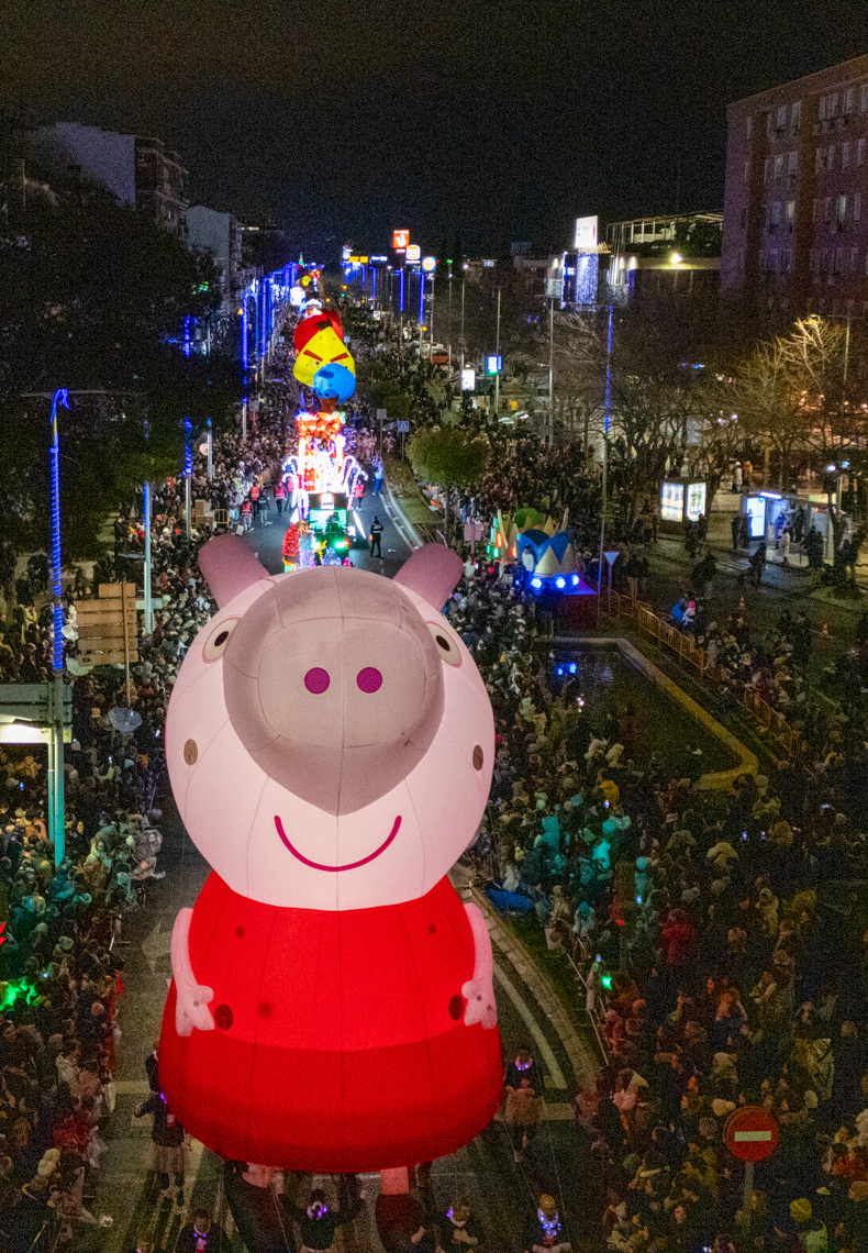 Torrejón de Ardoz, 7 de enero de 2025. Ante la dificultad que tenían los impresionantes globos de personajes infantiles de atravesar las calles estrechas que desembocan en la Plaza Mayor, el final de la Cabalgata se llevó a cabo en la Plaza de España con el saluda de los Reyes Magos y donde también tuvo lugar el Gran Espectáculo Final de Reyes.
