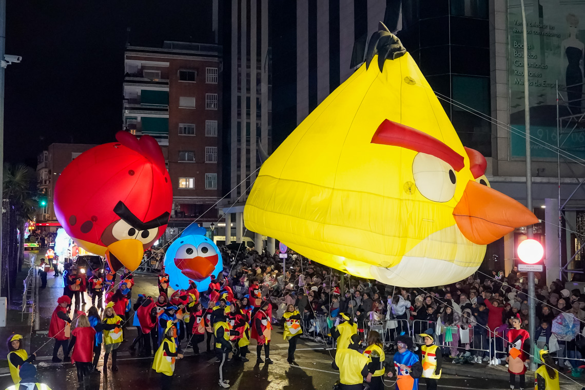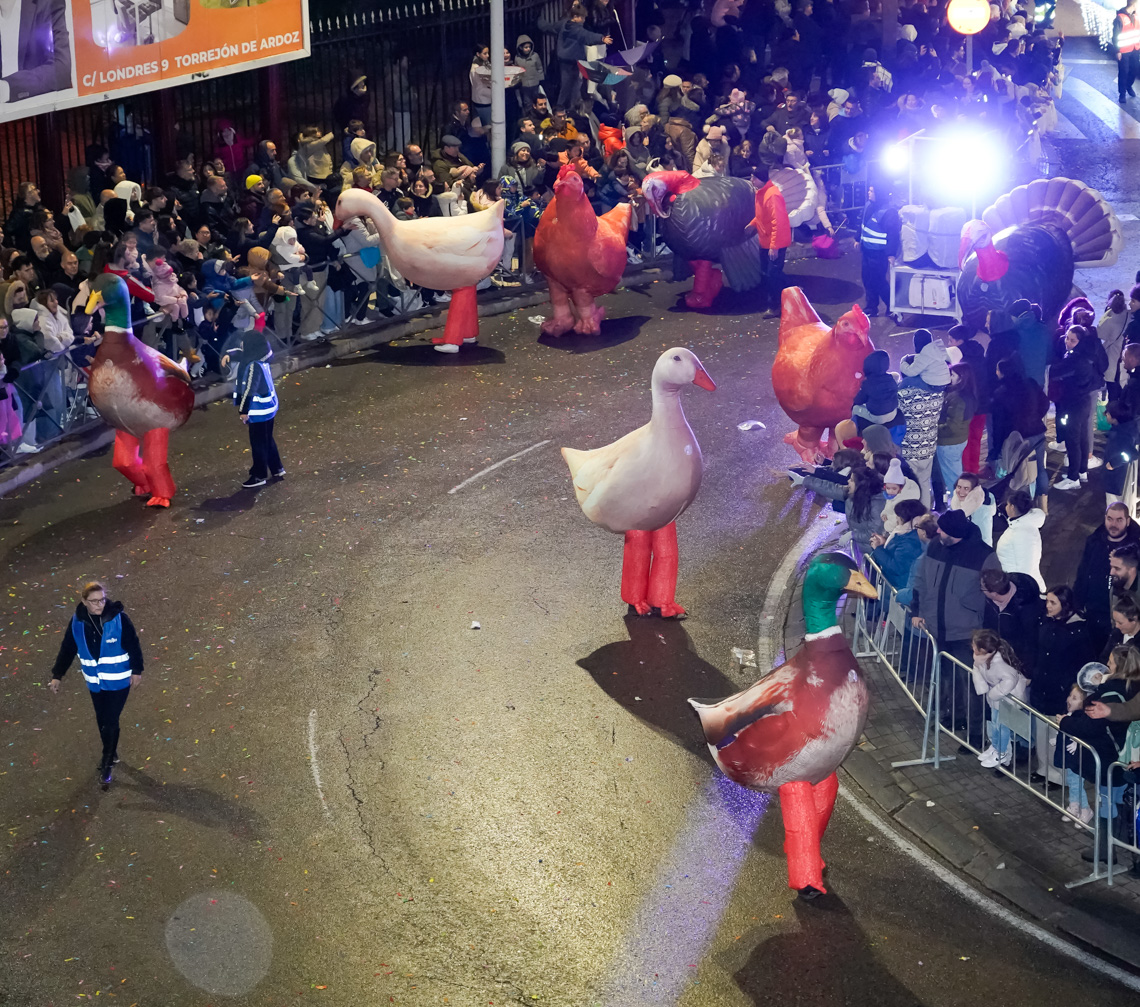 Este año, la comitiva contó con 13 originales carrozas de temática infantil con los personajes de animación más conocidos, los entrañables personajes navideños torrejoneros los Guachis, y las tres espectaculares de los Reyes Magos, acompañadas por un total de 21 pasacalles y elementos de animación, contando este año con numerosos elementos aéreos luminosos, todos ellos de las mejores compañías artísticas nacionales e internacionales, acompañados de nuestros Ángeles Navideños Gigantes.