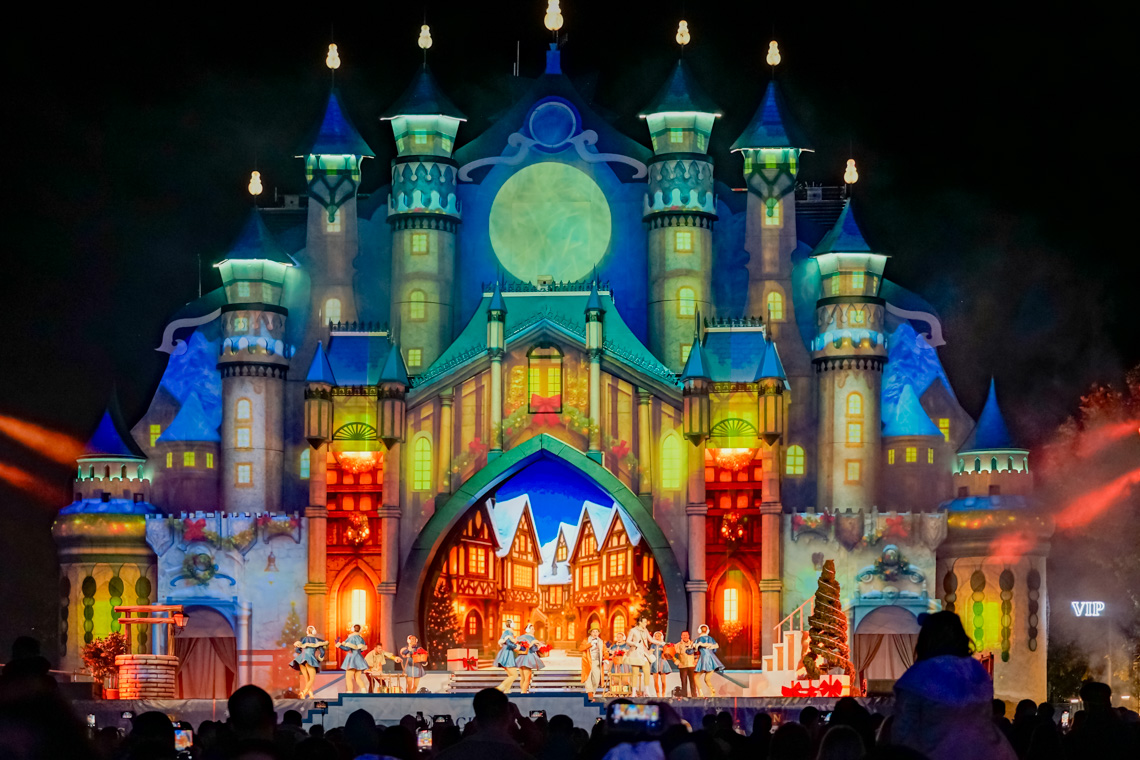 • El lugar más icónico del parque y la gran protagonista del recinto sigue siendo la Puerta Mágica, que cobra vida con un impresionante videomapping de 1.000 m². Sobre su fachada se proyecta un espectáculo visual y narrativo que nos traslada al universo mágico de Casca y Nueces, dos entrañables osos que nos guían por una historia encantada. Además, cada hora se presenta el espectáculo familiar El Secreto del Grinch, con música, baile y voces en directo.