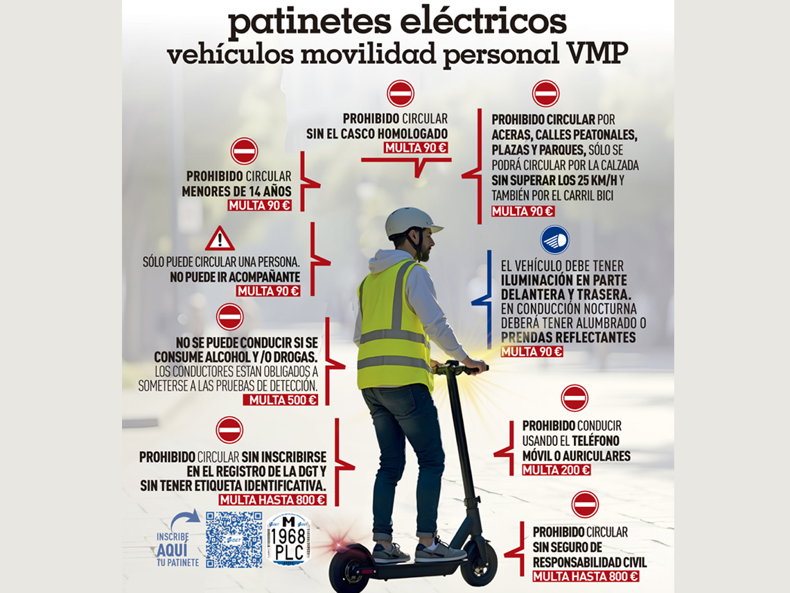 • Está prohibido circular por aceras, calles peatonales, plazas y parques, sólo se podrá circular por la calzada sin superar los 25 km/h y también por el carril bici (multas de 90 euros).