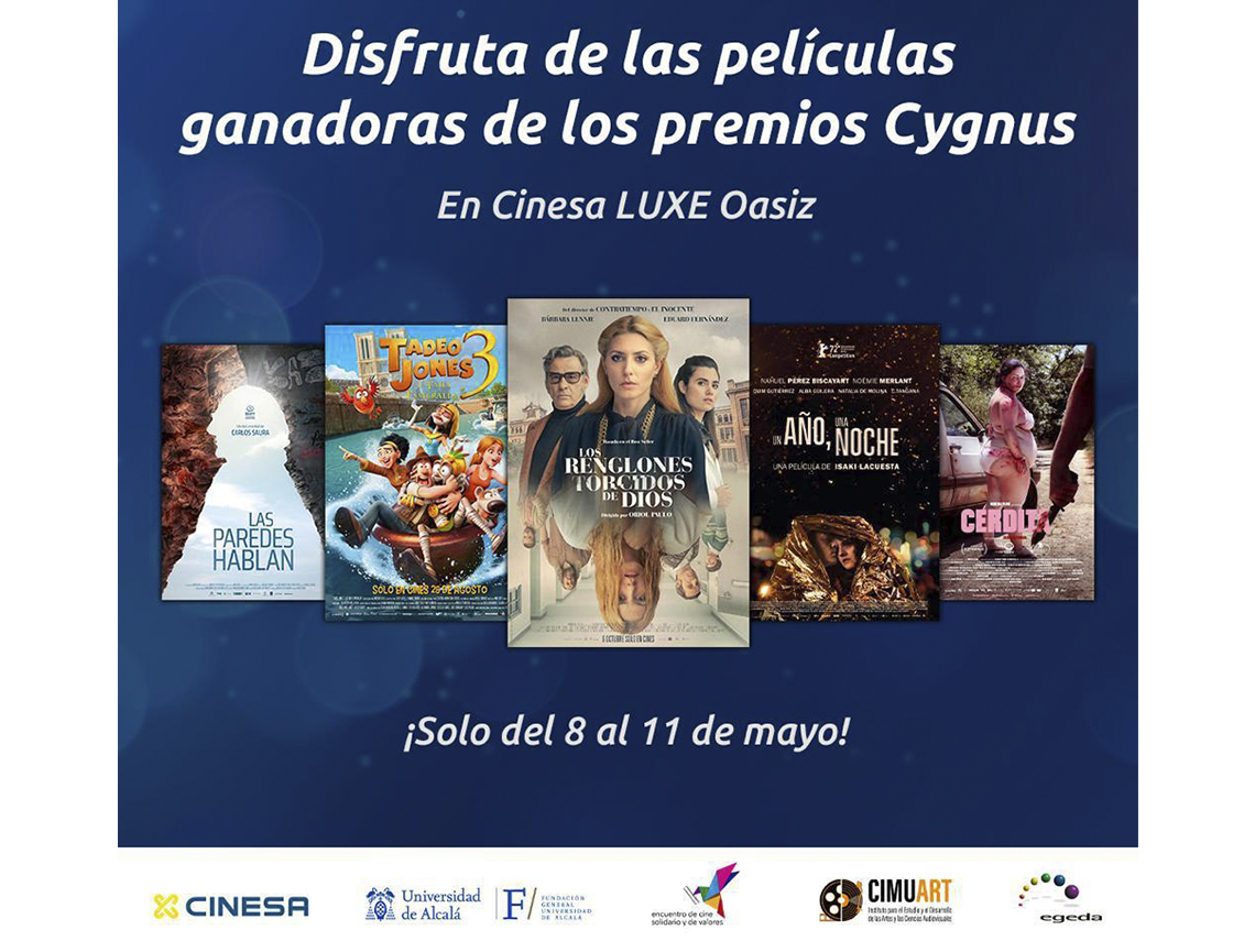 Las películas ganadoras de la quinta edición de los Premios Cygnus 2023 se proyectarán en Cinesa Luxe Oasiz del 8 al 11 de mayo próximos. Así, se podrá disfrutar de los filmes “Los renglones torcidos de Dios”, “Las paredes hablan”, “Tadeo Jones 3”, “Un año y una noche” y “Cerdita”.