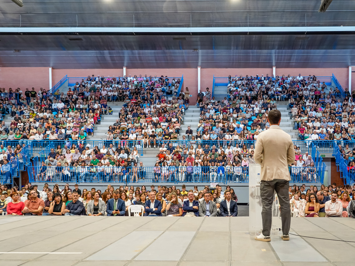 Torrejón de Ardoz, 24 de septiembre de 2025. Un abarrotado Pabellón Municipal José Antonio Paraíso acogió ayer la gala de la entrega de premios que recibieron los 245 mejores estudiantes de 19 colegios públicos, 8 institutos públicos, 5 colegios concertados, 2 colegios de Educación Especial (Rehto e Iker Casillas) y el centro oficial de Formación Profesional especializado en deporte (TAFAD). Entre ellos, repiten 6 alumnos de Primaria, 26 de Secundaria y 11 de Bachillerato. También, indicó el alcalde, Alejandro Navarro Prieto, “quisiera hacer extensiva esta felicitación y además de una forma muy especial, a aquellos alumnos que han sido premiados dentro de la categoría llamada esfuerzo y superación, porque son un ejemplo de motivación para nosotros por las ganas y el amor que ponen en aquello que hacen y estudian”.