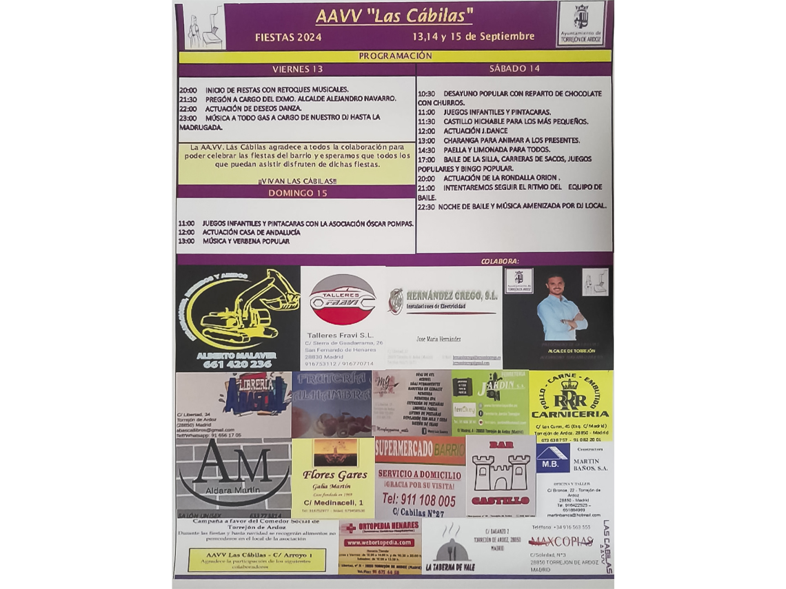 • Por último, los festejos del barrio de Las Cábilas comenzarán con la lectura del pregón a las 21:30 horas. A continuación, la actuación de “Deseos Danza” y música a todo gas a cargo de un dj. El sábado chocolate con churros, pintacaras y juegos infantiles, castillos hinchables y la actuación de J. Dance, además del tradicional reparto de paella con limonada. Por la tarde, baile de la silla, carreras de sacos, juegos y bingo populares. También actuará la Rondalla Orión y un dj pondrá música hasta la madrugada. Ya el domingo comenzará con juegos infantiles y pintacaras a cargo de la Asociación Óscar Pompas. Después, la actuación de la Casa de Andalucía y, para terminar, música y verbena popular