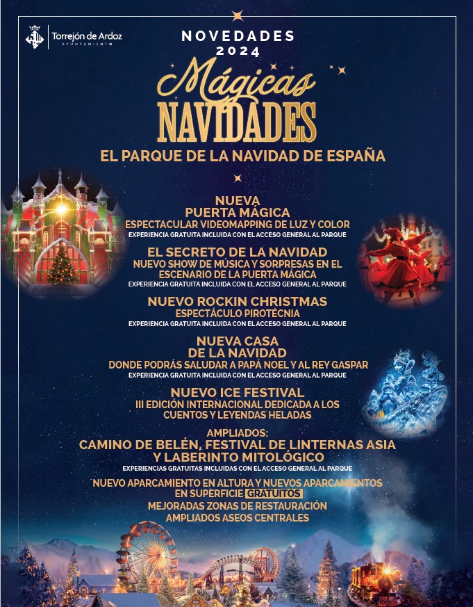 • Mágicas Navidades, el Parque de la Navidad, cuenta este año con novedosas experiencias gratuitas incluidas con el acceso general al parque, como la nueva Puerta Mágica, que ha dado un gran salto de calidad al nivel de los mejores parque temáticos familiares mundiales con un espectacular videomapping de luz y color; así como con El Secreto de la Navidad, nuevo show de música y sorpresas en el escenario de la Puerta Mágica; y con el nuevo Rocking Christmas, Espectáculo Pirotecnia. Además de la nueva Casa de la Navidad, donde podrás saludar a Papá Noel y al Rey Gaspar; y Camino de Belén, Festival de Linternas Asia y Laberinto Mitológico ampliados