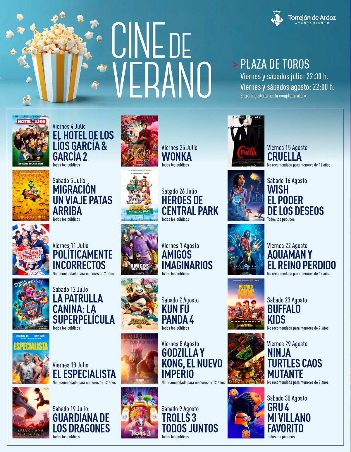 “Una de las citas más tradicionales en nuestra ciudad es el Cine de Verano. No hay nada más veraniego en Torrejón que tomar el bocadillo y un refresco, disfrutando de una de las últimas películas de éxito. Para ello la Plaza de Toros se llenará de las estrellas del séptimo arte con una programación seleccionada para todos los gustos y edades. Pueden acudir todas aquellas personas que lo deseen hasta completar aforo”, recordó el alcalde torrejonero.
