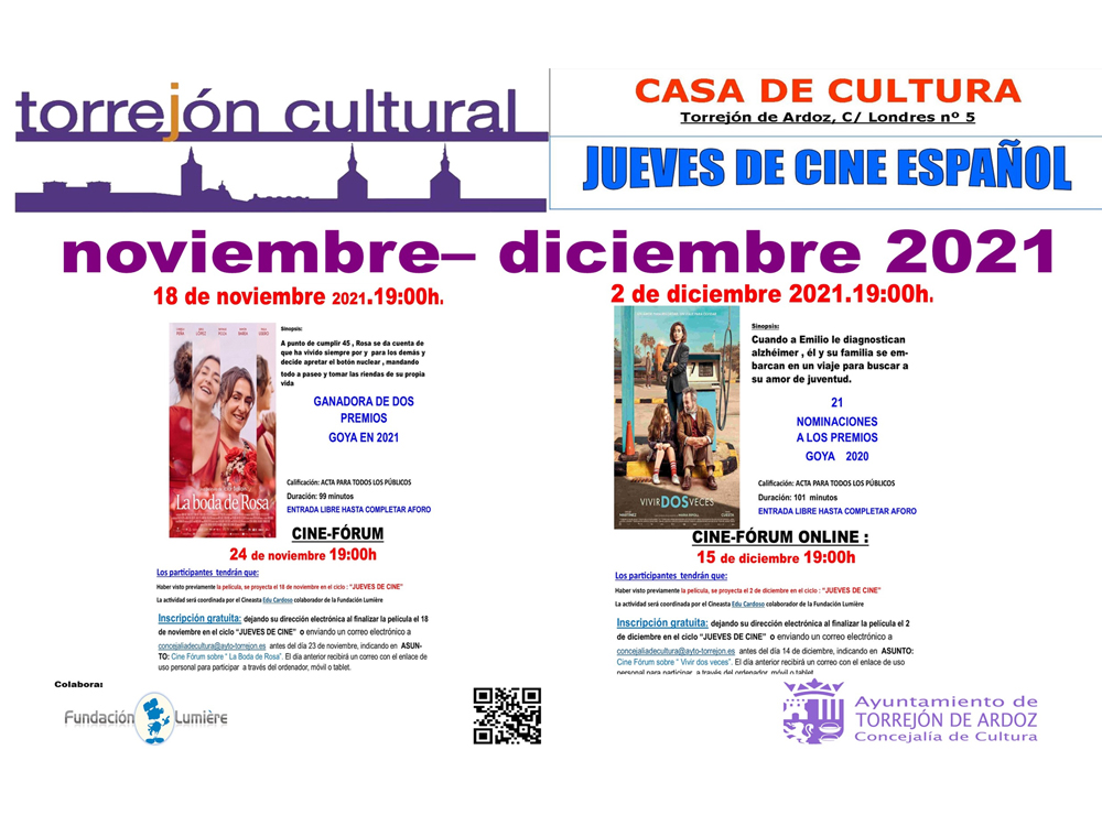 • Así, este nuevo ciclo de “Jueves de Cine” llega con la novedad de realizar un cine fórum online sobre la película que se proyecta. De esta forma, el 24 de noviembre habrá un cine fórum online sobre este filme que estará coordinado por el cineasta Edu Cardoso, y cuya inscripción se puede realizar dejando su dirección electrónica al finalizar la película de mañana o enviando un correo electrónico a concejaliadecultura@ayto-torrejon.es antes del día 23 de noviembre, indicando en asunto: “Cine Fórum sobre Las niñas”. El día anterior recibirá un correo con el enlace de uso personal para participar a través del ordenador, móvil o tablet