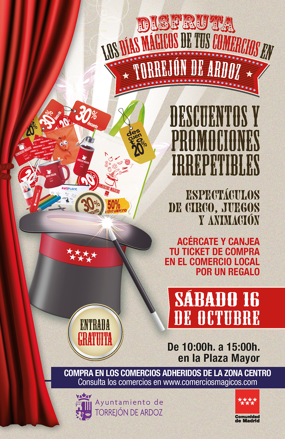 La iniciativa “Los días mágicos de tus comercios”, que organiza la Comunidad de Madrid, llega mañana sábado a Torrejón de Ardoz. Desde las 10:00 hasta las 15:00 horas habrá espectáculos de animación y magia en la Plaza Mayor y todas aquellas personas que realicen compras en los establecimientos participantes recibirán un regalo seguro. Además, aquellos que quieran también podrán entrar en el sorteo de un vale de 100 euros. En el caso de los comercios, el que haya canjeado más tickets se llevará una cena para dos personas valorada en 100 euros.
