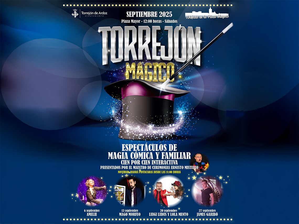 • “Torrejón Mágico” se está celebrando todos los sábados de este mes de septiembre en la Plaza Mayor. Así, mañana sábado, 20 de septiembre, llegarán Luigi Ludus y Lola Mento. Por último, el 27 de septiembre, los espectáculos finalizarán con James Garibó