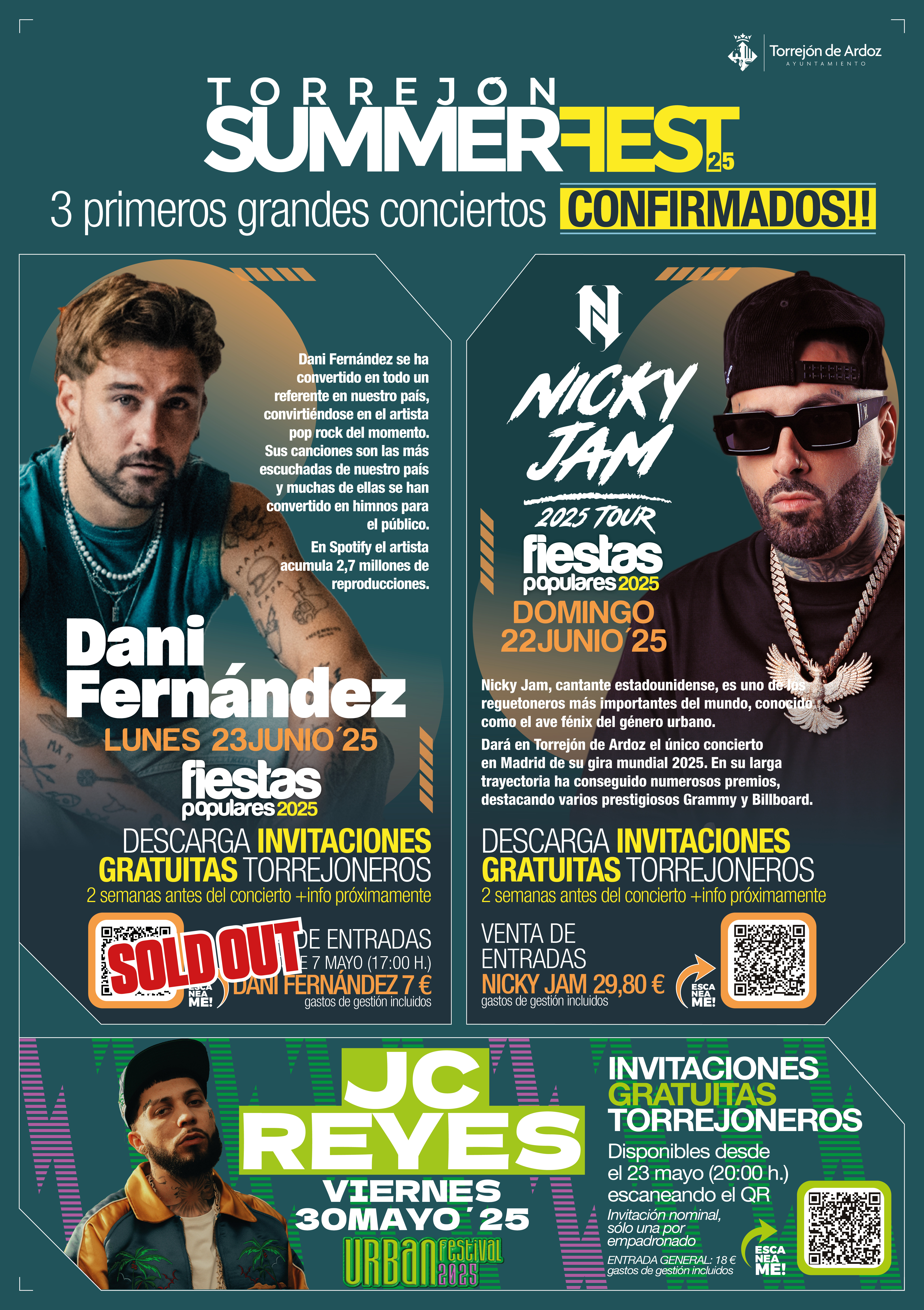 Hoy, viernes, 23 de mayo, a partir de las 20:00 horas, se ponen a disposición de los torrejoneros las invitaciones para el concierto de JC Reyes que actuará en el Torrejón Summer Fest-Urban Festival el viernes, 30 de mayo. Las invitaciones serán nominales y solo se podrá descargar una por empadronado. El cantante sevillano, reconocido como uno de los mayores exponentes de la música urbana en la escena contemporánea, logrando ser uno de los artistas españoles más escuchados en Spotify en 2024, y alcanzando el número 1 estas últimas semanas. El concierto en Torrejón de Ardoz será la única oportunidad de verle en directo en Madrid en lo que queda de 2025. Además, continúan a la venta las entradas que se pueden comprar al precio de 18 euros, gastos de gestión incluidos. Las invitaciones y las entradas se pueden obtener en el siguiente enlace: https://wlb.vivaticket.es/espectaculo/urban-festival--jc-reyes/JCREYES