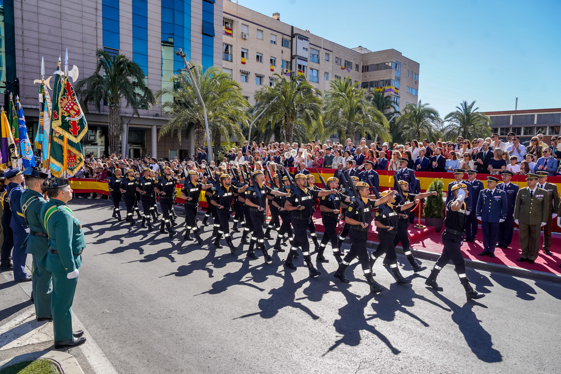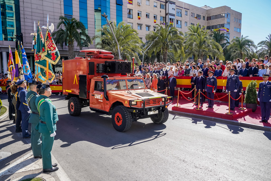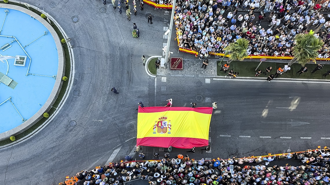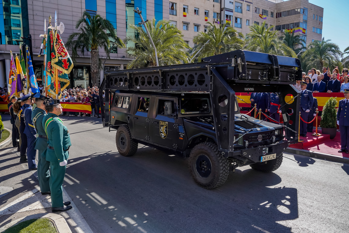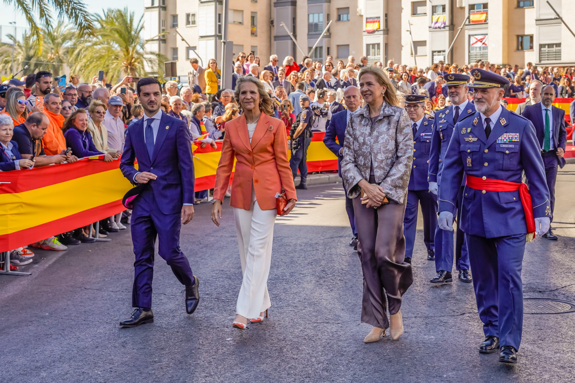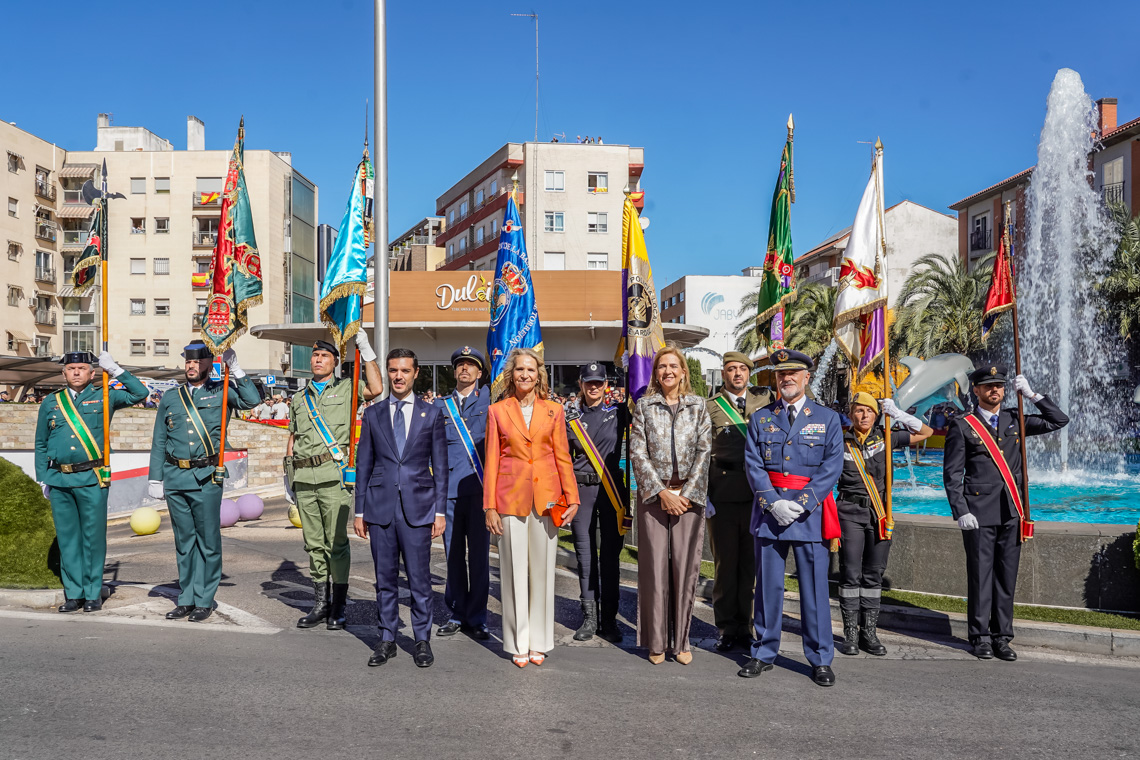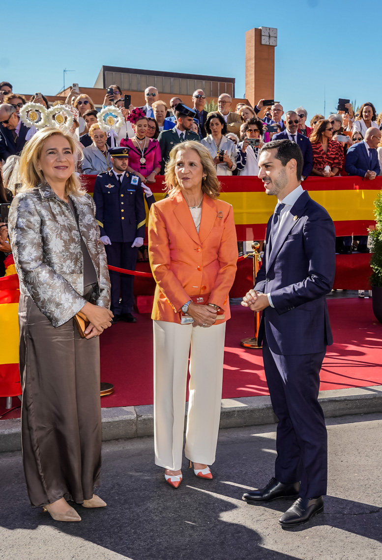 Torrejón de Ardoz, 6 de octubre de 2025. El Homenaje a la Bandera se confirmó como uno de los mejores de la Comunidad de Madrid y contó con la presencia de las infantas Elena y Cristina que hicieron la ofrenda a los caídos en un emotivo acto y desfile militar que debido al fuerte viento no pudo contar con la participación de la Patrulla Acrobática de Paracaidismo del Ejército del Aire, pero sí con una importante representación de nuestras Fuerzas Armadas, así como de las Fuerzas y Cuerpos de Seguridad del Estado.