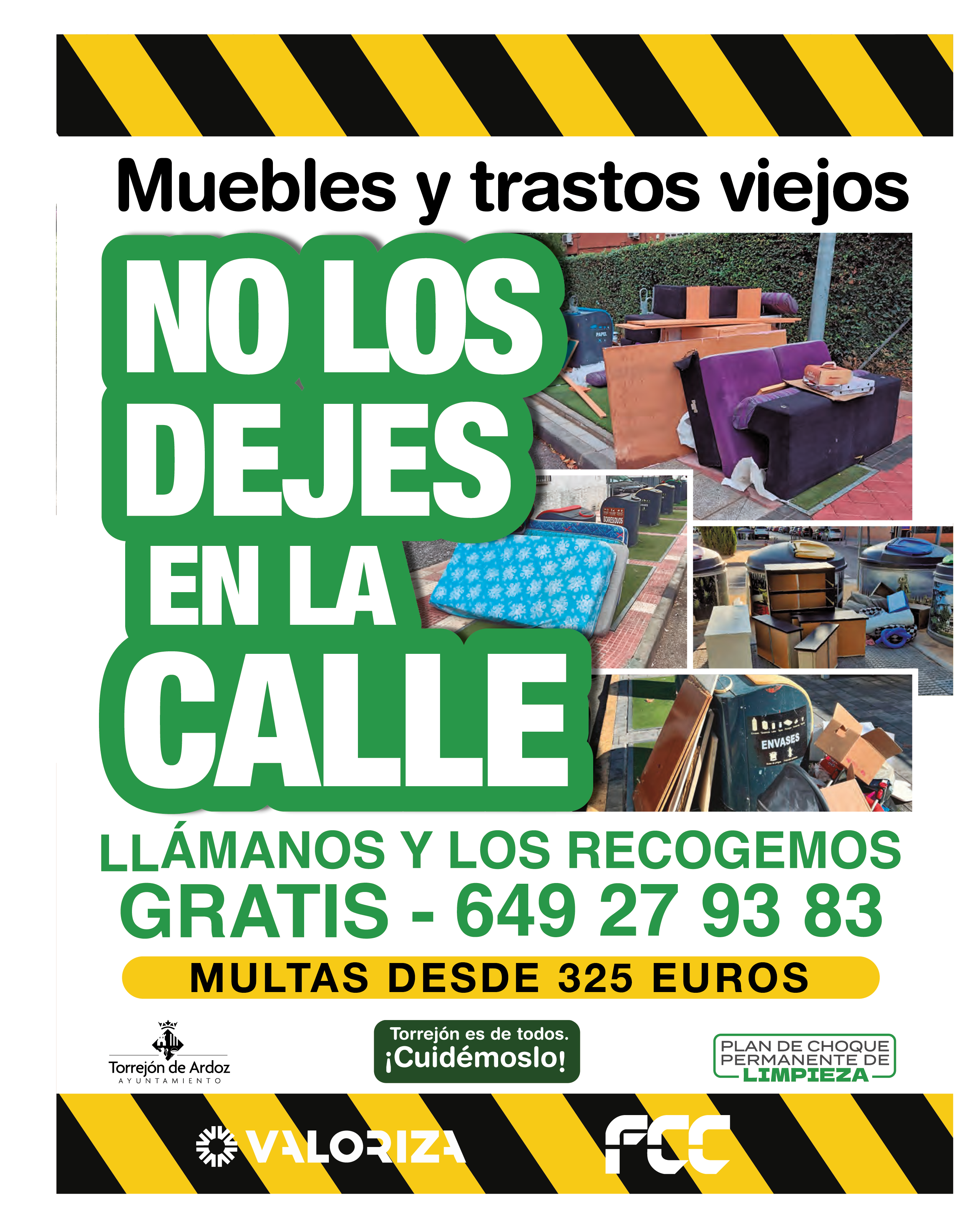 Torrejón de Ardoz, 11 de noviembre de 2025. Además, el Ayuntamiento de Torrejón de Ardoz cuenta con un servicio gratuito de recogida de muebles en el teléfono 649279383 en horario de 9:00 a 19:00 horas de lunes viernes o en e-mail: enserestorrejon@utersutorrejon.es para que le indiquen al vecino el lugar y la hora para depositar el mueble. Dejar los muebles junto a los contenedores o en la calle, sin usar el servicio de recogida gratuita del Ayuntamiento, puede conllevar sanciones desde 325 euros.