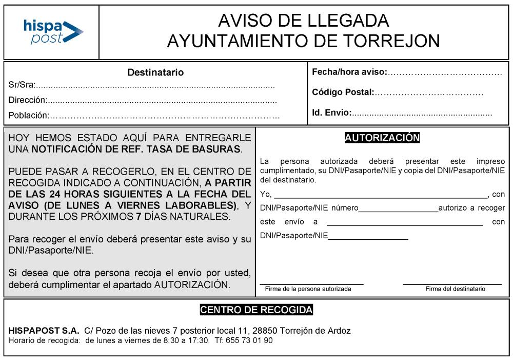 Si no se recibe, se dejará en su buzón un aviso con este modelo para ir a recogerla en las oficinas de Hispapost ubicadas en la calle Pozo de las Nieves Nº7 Posterior, local 11 (de lunes a viernes de 8:30 a 17:30 horas).