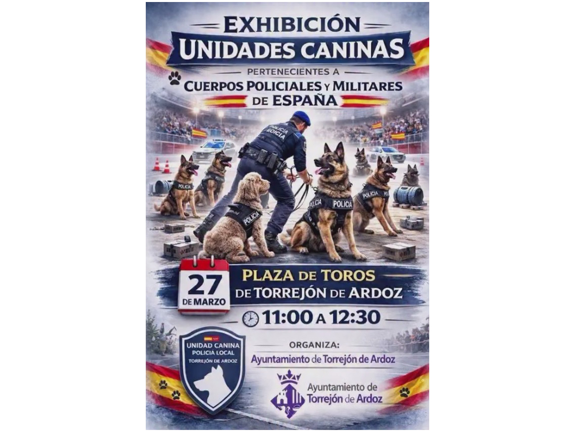 Este viernes, 27 de marzo, la Plaza de Toros acogerá una espectacular exhibición de las unidades caninas de los principales Cuerpos Policiales y Militares de España, que mostrará cómo trabajan estos perros altamente adiestrados junto a sus guías. La cita, pensada para todos los públicos, especialmente para familias y amantes de los animales, contará con la participación de la Unidad Canina de la Policía Local de Torrejón de Ardoz y tendrá lugar de 11:00 a 12:30 horas con entrada gratuita abierta al público en general hasta completar aforo. Al ser el viernes día no lectivo, los escolares, acompañados de sus familiares podrán acudir a disfrutar de la exhibición que tiene entrada gratuita.