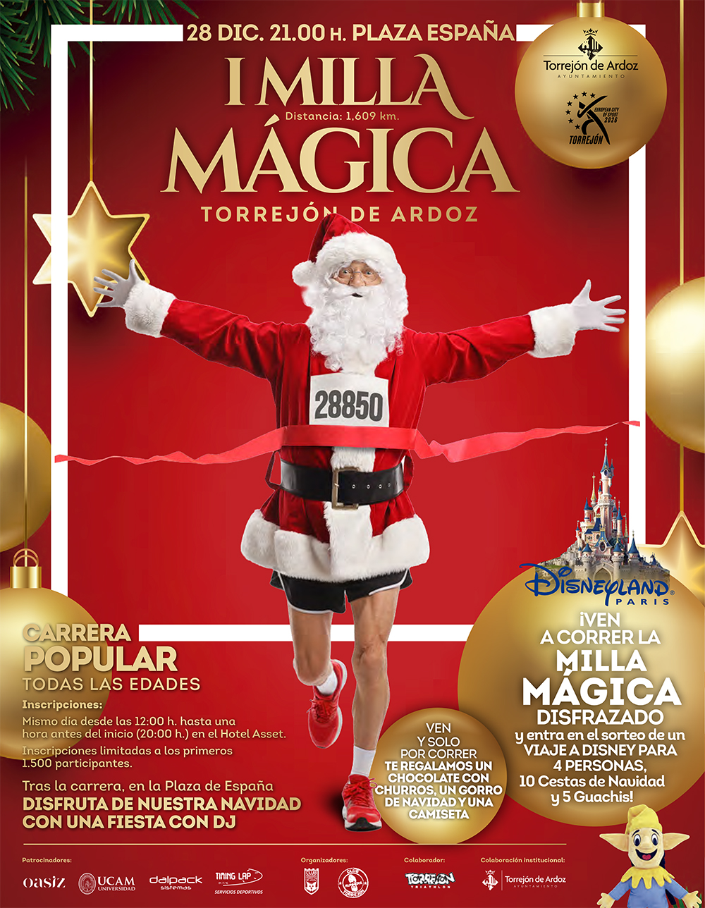 Torrejón de Ardoz, 18 de diciembre de 2025. La iniciativa consta de dos modalidades bien diferenciadas. Por un lado, está la prueba no competitiva para todas las edades, en la que los participantes que vayan disfrazados entrarán en el sorteo de un viaje a Disney para 4 personas, 10 cestas de Navidad y 5 Guachis. Las inscripciones son gratuitas y se pueden realizar el mismo día de la prueba, desde las 12:00 hasta las 20:00 horas, en el Hotel Asset (avenida Constitución, 32), estando limitadas a las 1.500 personas.