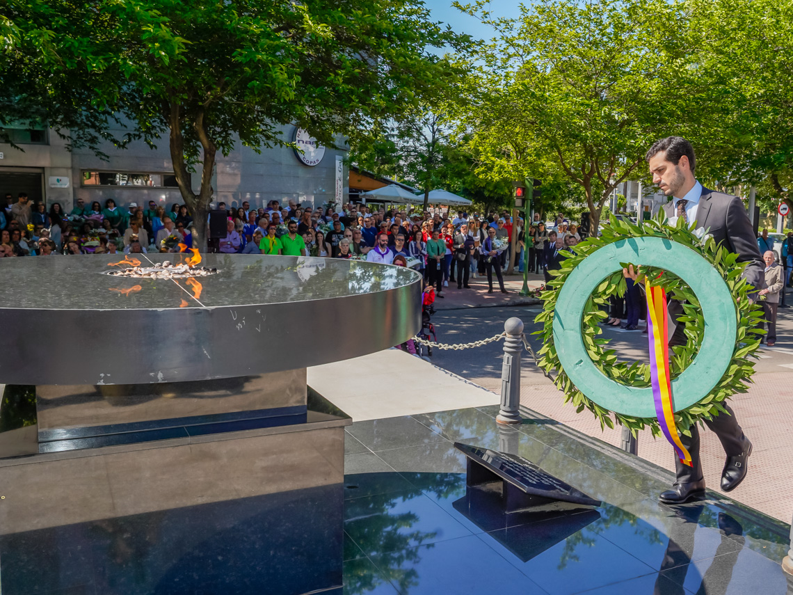 • El sentido homenaje comenzó con un minuto de silencio y una ofrenda de una corona de laurel por parte del alcalde, Alejandro Navarro Prieto, en nombre de la ciudad de Torrejón de Ardoz, a la que siguieron las ofrendas florales realizadas por los portavoces de los grupos políticos representados en el Ayuntamiento, entre otras autoridades, los familiares de las víctimas, las asociaciones de la localidad y los vecinos fueron los protagonistas de este acto en el que también sonaron algunas de las canciones más representativas de la pandemia