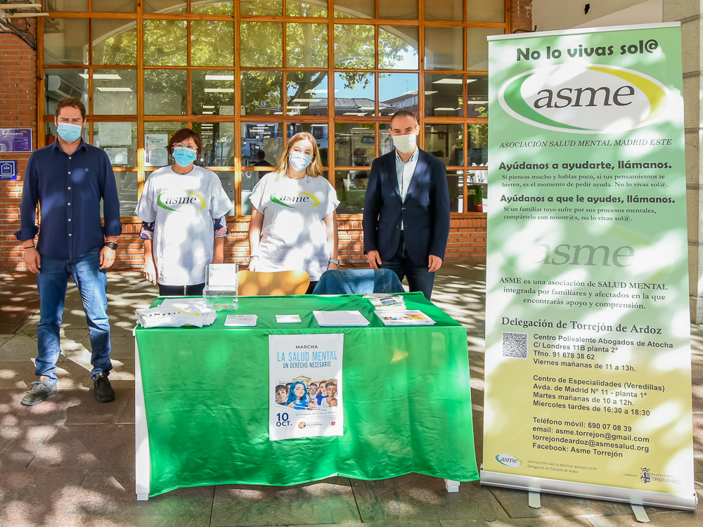 Torrejón de Ardoz se ha sumado a la celebración del Día Mundial de la Salud Mental que tendrá lugar este domingo 10 de octubre. Por ello, la Asociación de Salud Mental Este (ASME) ha colocado una mesa informativa en la Plaza Mayor que ha sido visitada esta mañana por el alcalde, Ignacio Vázquez, y el concejal de Bienestar, Educación e Inmigración, Rubén Martínez, acompañados por su presidenta, Ana Ródenas, con el objetivo de sensibilizar e informar a la población acerca de cuestiones relativas a los diferentes trastornos mentales que existen, así como dar a conocer la labor que esta entidad lleva a cabo en la ciudad.