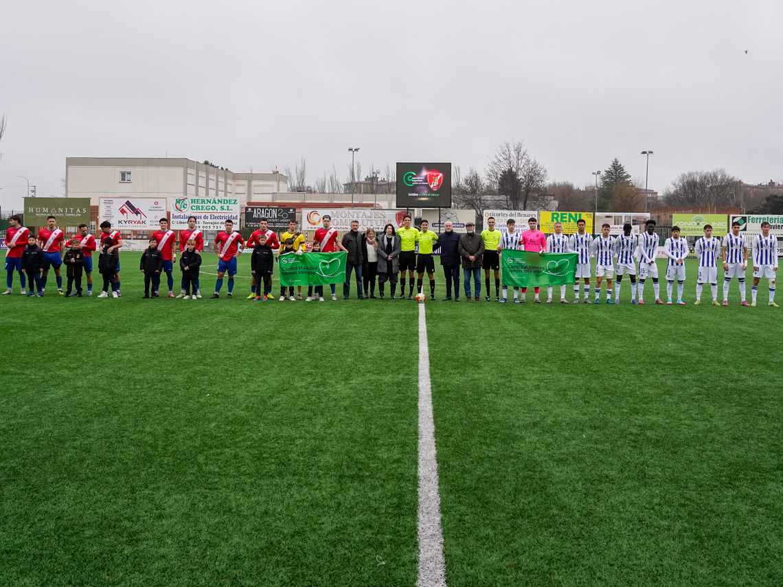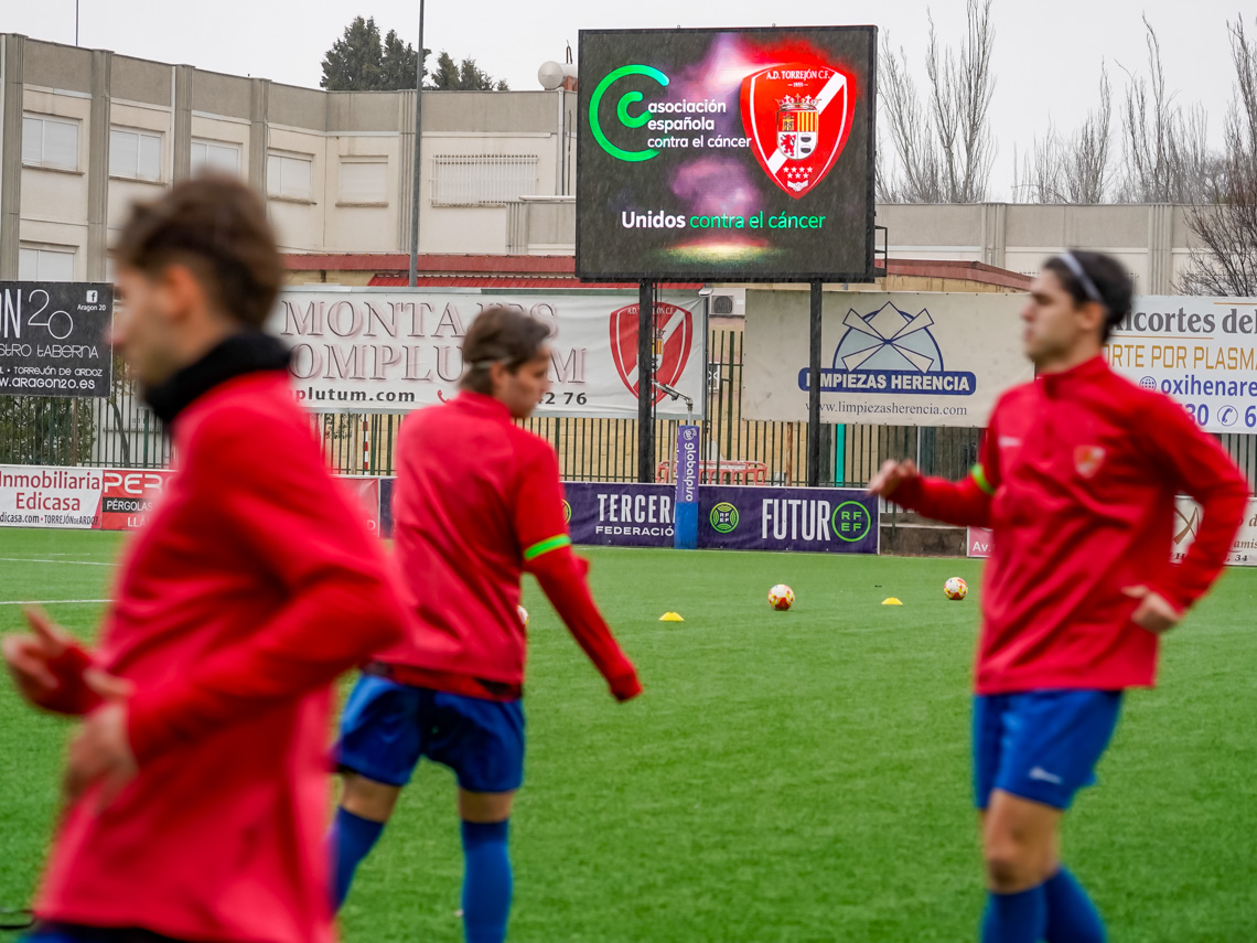 • En este sentido, el mundo del deporte también ha aportado su granito de arena y, en colaboración con la Asociación Española contra el Cáncer de la delegación en Torrejón, ha realizado distintas actuaciones. Entre ellas, al inicio del partido de la jornada pasada del primer equipo de la AD Torrejón CF ante el C.D. Leganés “B”, los directivos de la A.D Torrejón C.F., junto a la concejala de Deportes y Turismo, Míriam Gutiérrez, el edil de Cultura, José Antonio Moreno, y los responsables de la Junta Local de la AECC mostraron unas pancartas de apoyo a los enfermos que luchan contra esta enfermedad