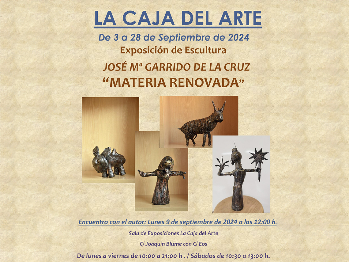 • En La Caja del Arte se podrá ver la exposición de escultura “Materia renovada”, de José María Garrido que permanecerá abierta hasta el próximo 28 de septiembre, en horario de lunes a viernes de 10:00 a 21:00 horas y el sábado de 10:30 a 13:00 horas