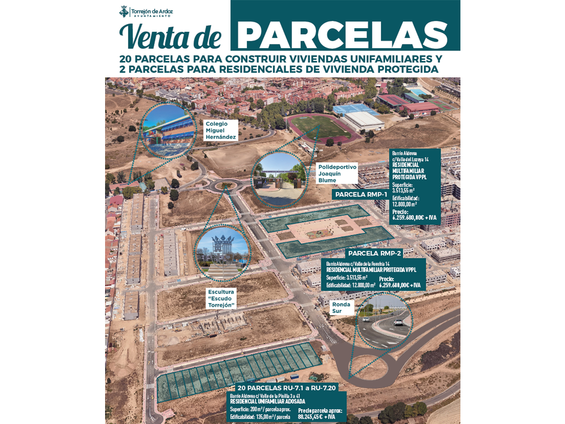 El Ayuntamiento de Torrejón de Ardoz pone a la venta 20 parcelas para construir viviendas unifamiliares y 2 parcelas para residenciales de vivienda protegida en el nuevo barrio de Aldovea. Para más información y resolver dudas los interesados pueden ponerse en contacto con el Departamento de Contratación en el teléfono 91 678 95 56 o presencialmente en la 2ª planta del Ayuntamiento en horario de 8:30 a 14:00 horas.