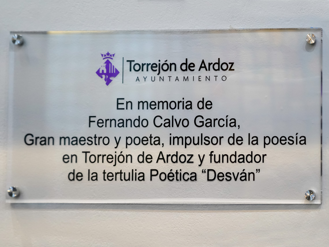 Una placa en el Centro Cultural Las Fronteras siempre recordará al poeta local, Fernando Calvo García, fundador de la Tertulia Poética Desván. El Ayuntamiento de Torrejón de Ardoz ha decidido dedicar una placa a este excelente escritor, que el alcalde, Alejandro Navarro, acompañado por su viuda, Francisca Morales, descubrió el pasado 21 de marzo. La cita se organizó con motivo de la celebración del Día Mundial de la Poesía, que tuvo lugar el pasado 21 de marzo, dentro de un acto organizado por la Tertulia Poética Desván. Bajo el título “Un recuerdo, un poema” el acto comenzó con la presentación a cargo de Juana Sánchez y Carmen G.G. para después continuar con la actuación del grupo de baile "Amanecer", el recital “Tenemos la palabra”, con Ángel Abeso y Sara Segurado y la elaboración de un poema con la colaboración voluntaria del público.